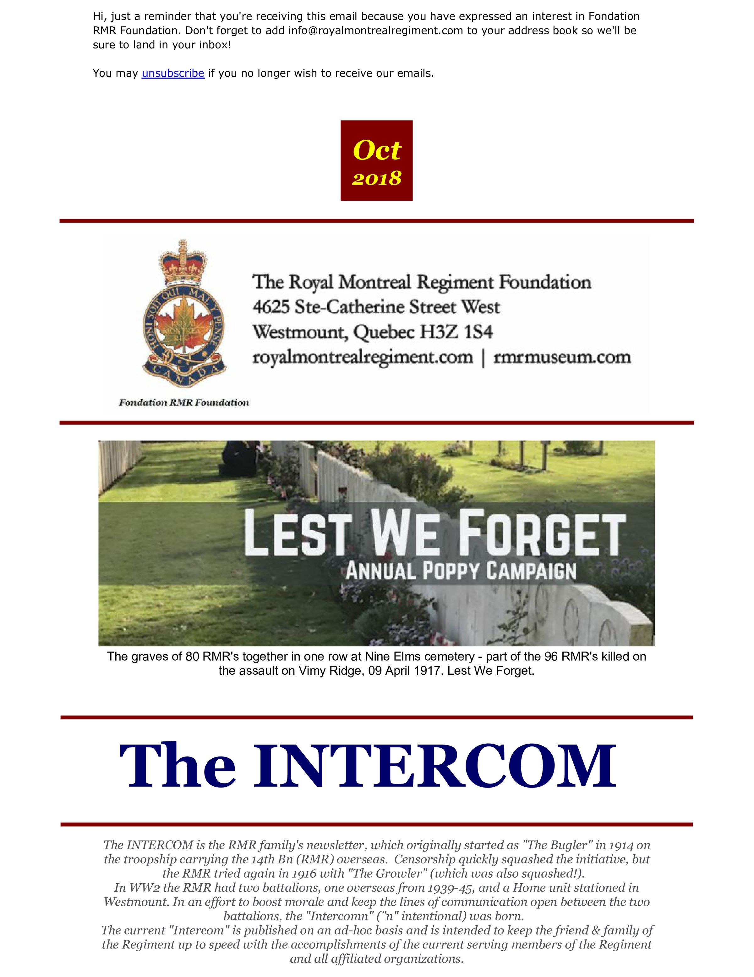 Robinson, Colin Angus, Thibault, William J., Petrilli, Antonio, Hall, Harry F., Leroux, Stephan, Gohier, Georges E. R., Guerin, Suzanne C., McIntyre, Robbin L., The Royal Montreal Regiment Association, Branch 14, Royal Canadian Legion, Davie, Wayne, Shone, John Lindegaard, RMR Museum, Molson, Andrew, Tartiere, Joel