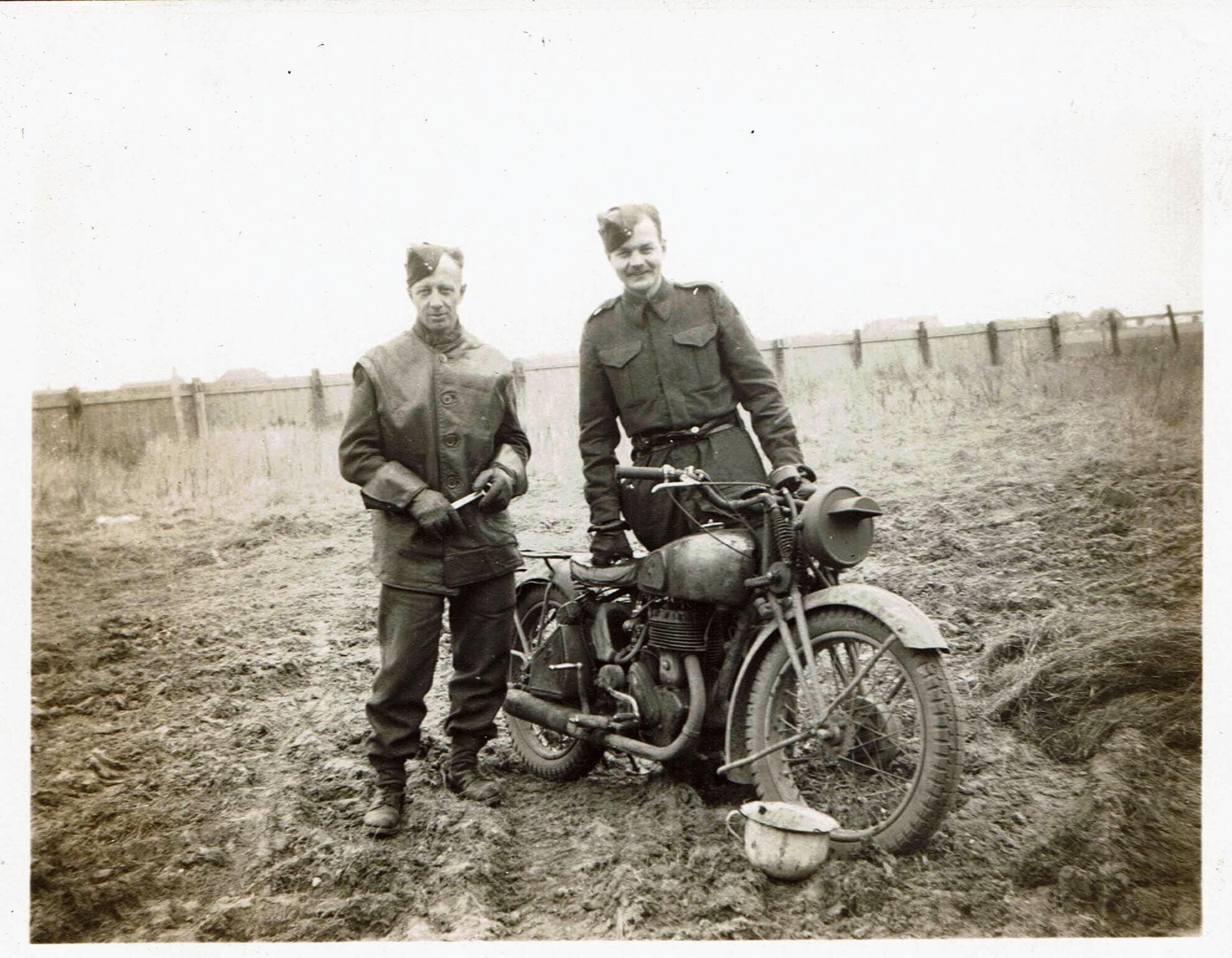 A black and white photo of Jerry Gault and Thomas Scovil standing next to a Norton WD 16H motorcycle while at Selsey Bill in Sussex, England. The headlight of the motorcycle has been masked to reduce the visibility and protect the driver from being seen by enemy aircraft.Photograph Details