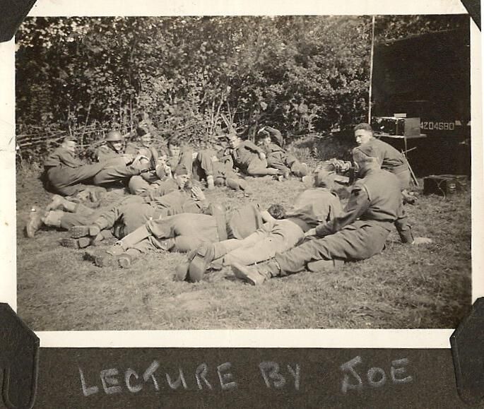 A black and white photo of a group of soldiers lying about in a clearing listening to Joe Hector as he explains something. In the background we can see a 30cwt CMP truck and what appears to be a wireless Set No. 19 mobile radio transceiver. This radio was designed for the use of the armoured corps.Photograph Details