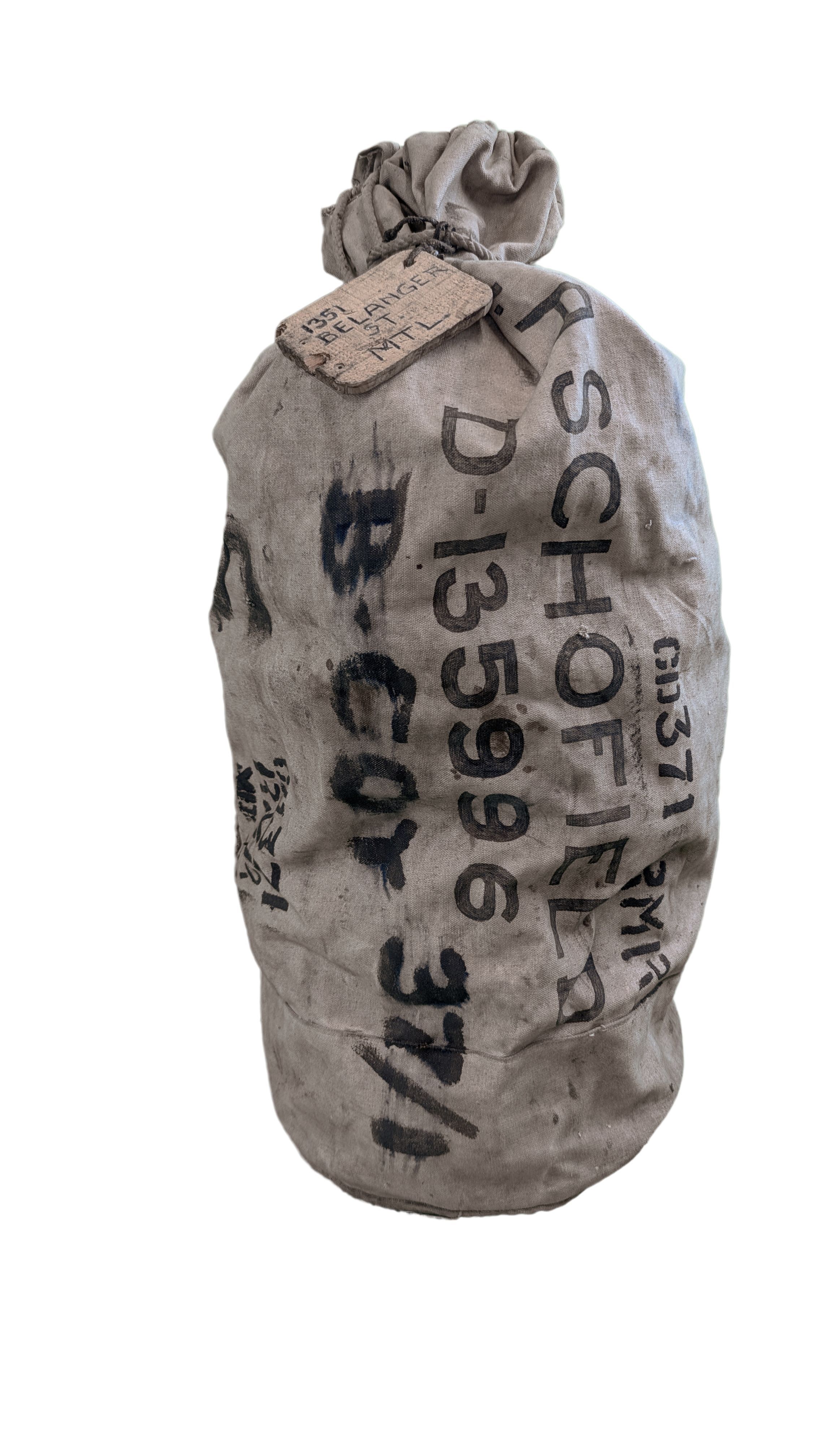 Canvas kit bag belonging to Lance Corporal Charles Arthur Schofield. The large bag has Schofield's name and information written in black (RMR, NUMBER, B-COY etc). The bag is secured at the top with a wooden address tag attached to a rope. On the wooden tag, carved and traced in black is his address '1351 Belanger St. MTL'. Every soldier would have a rudimentary bag like this one to store their belongings.