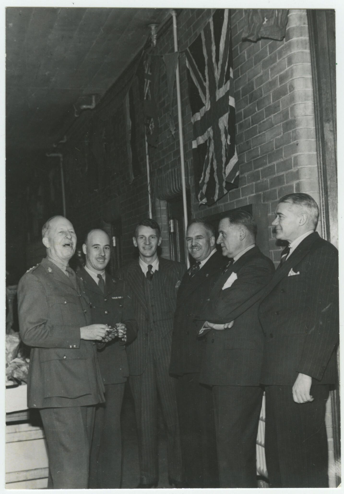 Group photo L-R: 1. Capt. Bill Fowler ; 2. Major Basil A. H. Smith ; 3. Lt. Gilbert ; 4. Maj-Gen C.B. Price ; 5. Lt-Col. J.E. McKenna; 6. Brig-Gen G.V. Whitehead