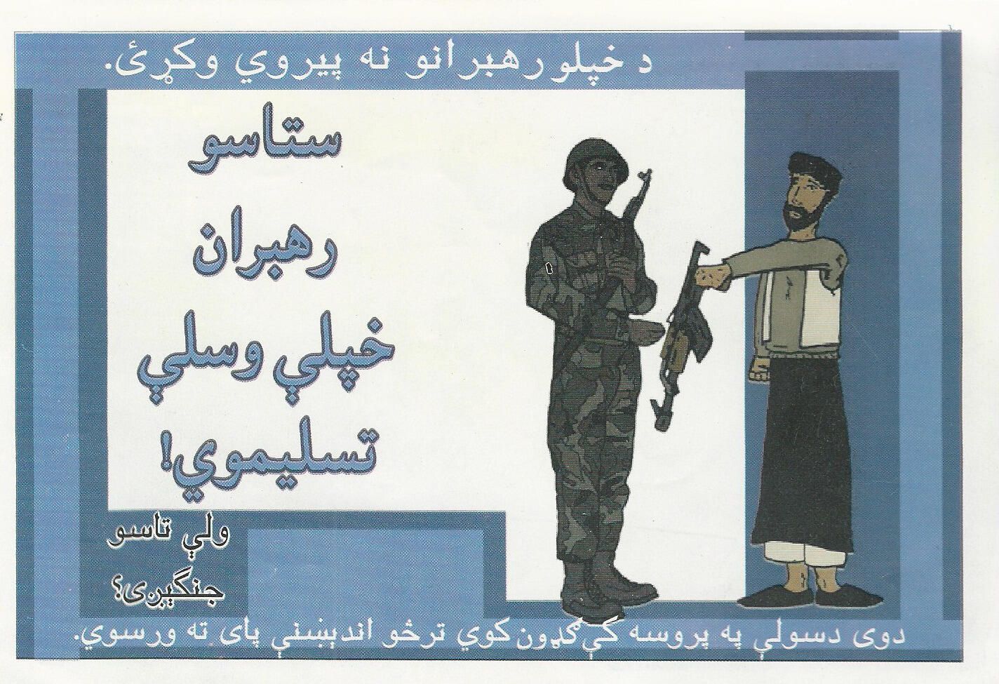 A propaganda leaflet showing a Taliban approaching a member of the Afghan National Army to surrender. The leaflet tries to encourage Taliban to submit their weapon and participate in the process of peace in the country.