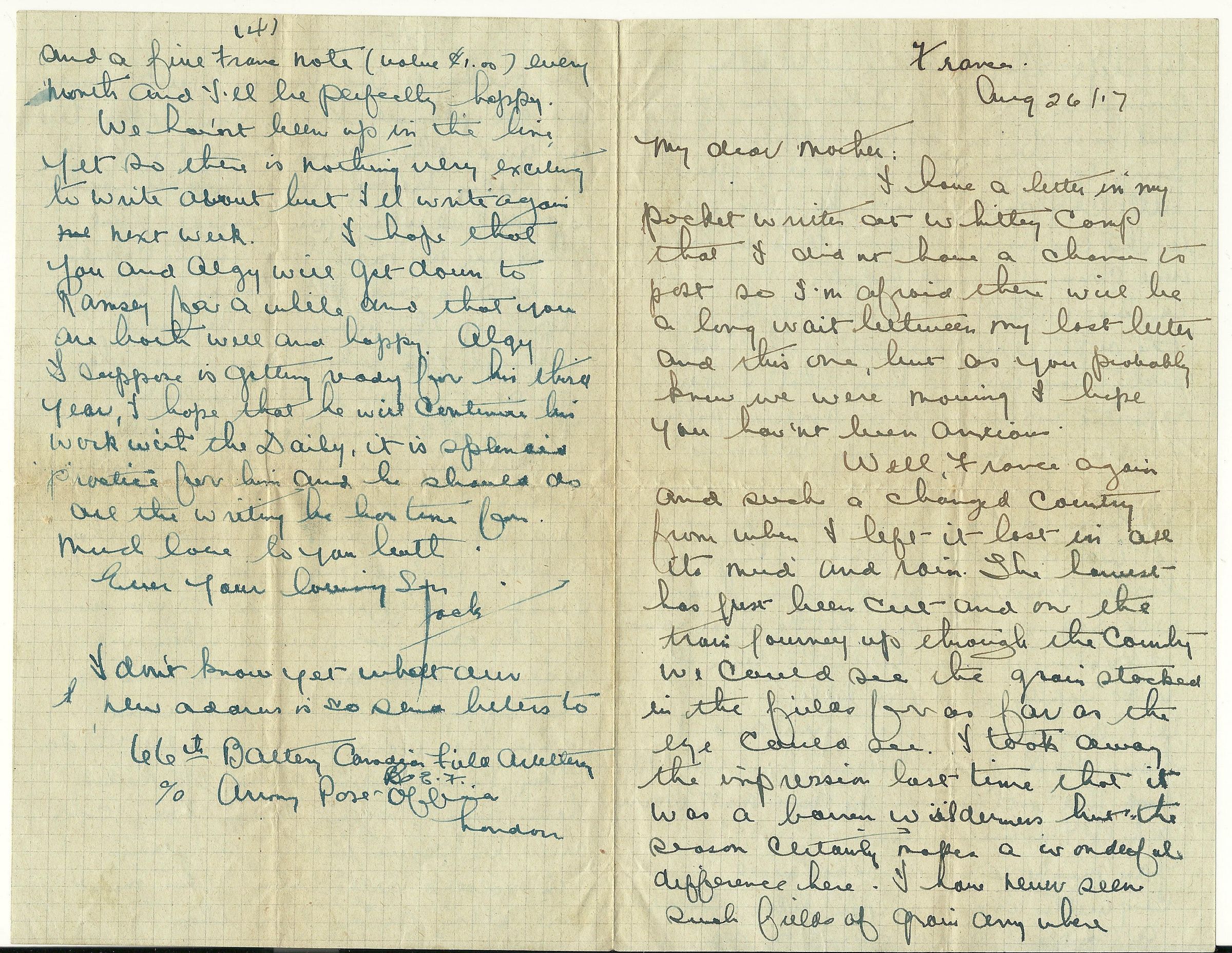A page, two-sided on grid paper. Half the message is written in black ink and the other half in blue ink. The letter is accompanied by a rectangular envelope with a sticker that reads "Opened by Censor".