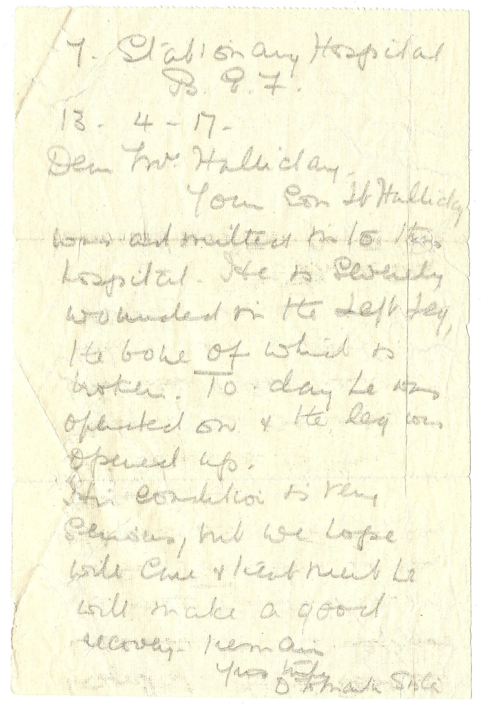 A handwritten note dated April 13, 1917, addressed to the mother of Lieutenant William Jeffrey Holliday from a Nursing Sister telling of his medical condition due to wounds.Archive Details