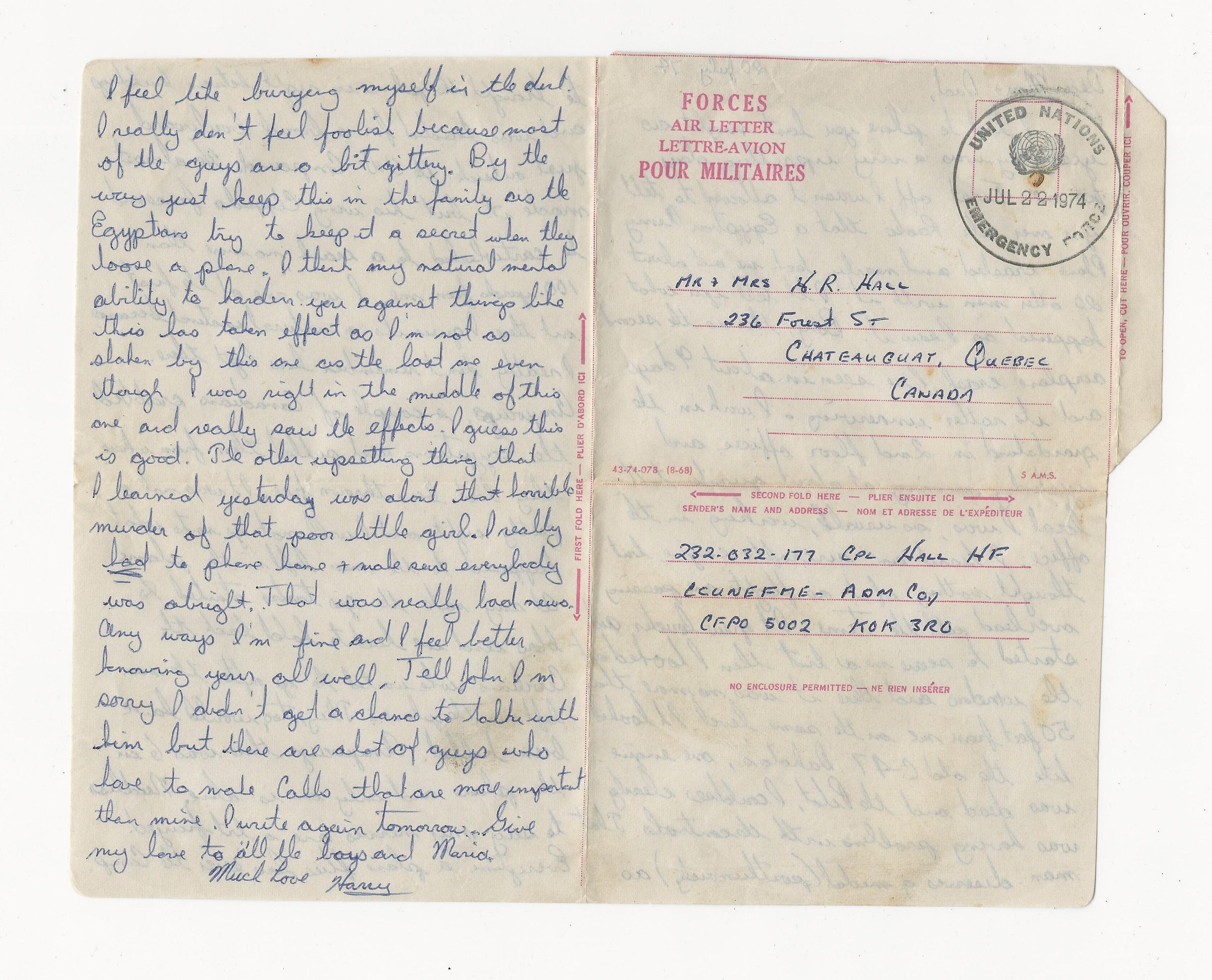 Letter from Cpl Harry Hall to his parents during his UNEF II mission in Egypt. The letter is about the Egyptian cargo plane crash in the UN Compound.Archive Details