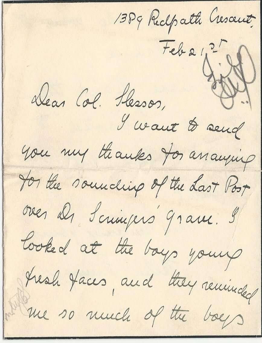 A handwritten letter from Mrs. Ellen Scrimger to Lieut.-Col. J.E. Slessor, Commanding Officer of The Royal Montreal Regiment, thanking him for arranging for buglers of the Regiment to sound The Last Post over the grave of her husband, Lieut.-Col. Dr. Francis A.C. Scrimger, VC, at the time of his funeral.Lexicon