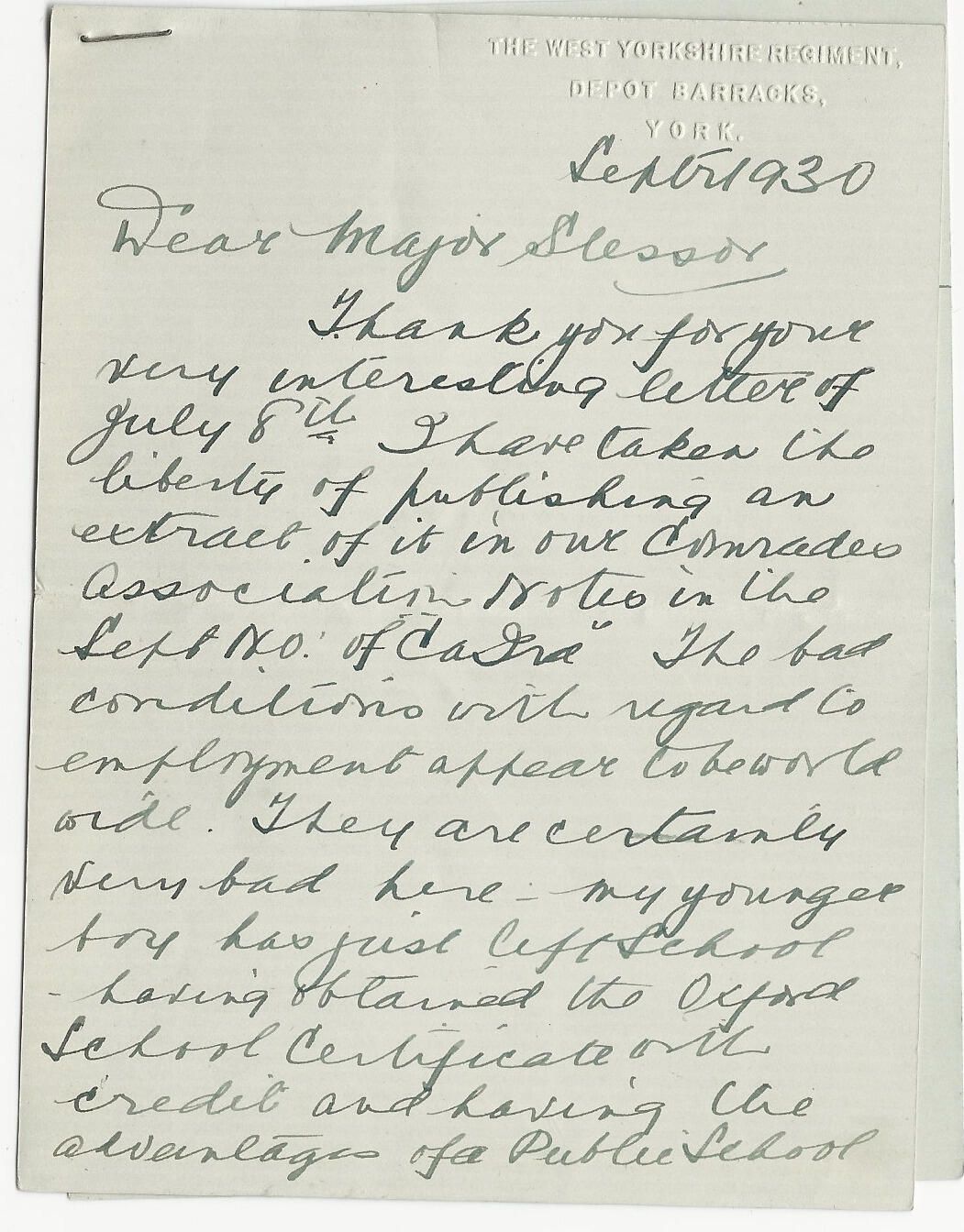 A hand written letter from C. Hinchcliffe of The West Yorkshire Regiment writing from their Depot Barracks at York, to Major J.E. Slessor of The Royal Montreal Regiment thanking him for providing news of the RMR. In return he tells of the poor employment conditions in Britain about a year after the great stock market crash of 1929.Lexicon