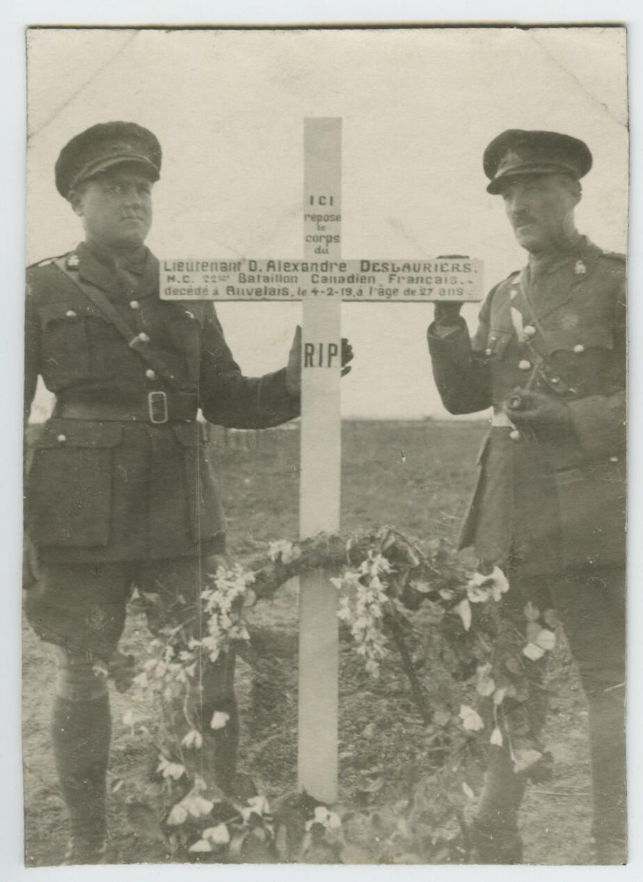 Black and white picture of two officers of the 22nd Bn. CEF standing on either side of the grave marker of Lieut. Donia Alexandre Deslauriers, MC, with a floral wreath leaning against it. He died on 4 February 1919, as a result of broncho pneumonia according to his service records.Photograph Details