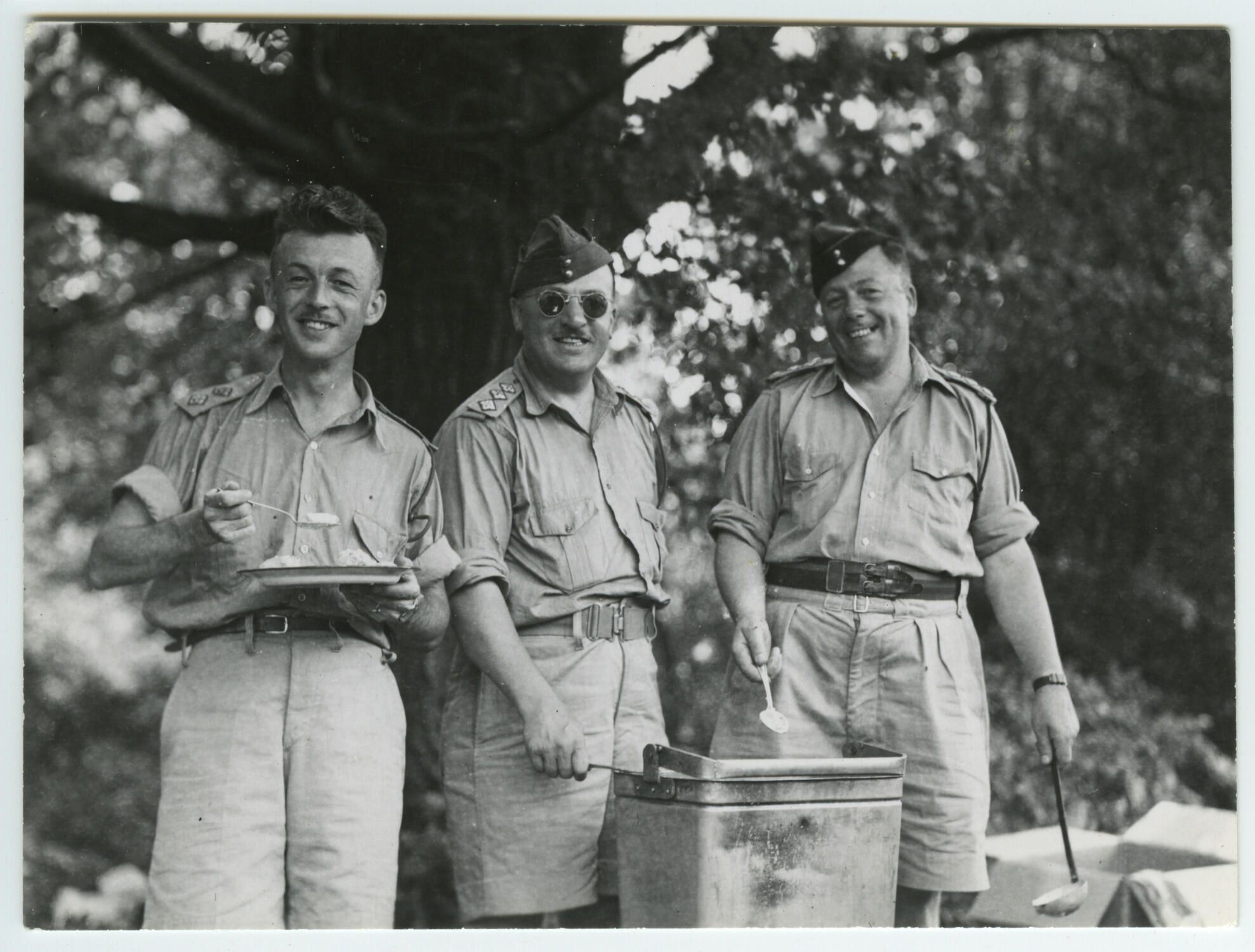 Three officers in Summer service dress uniforms are enjoying the outside canteen. The man on the right seems to be part of the staff serving the food from a metal canister.Photograph Details