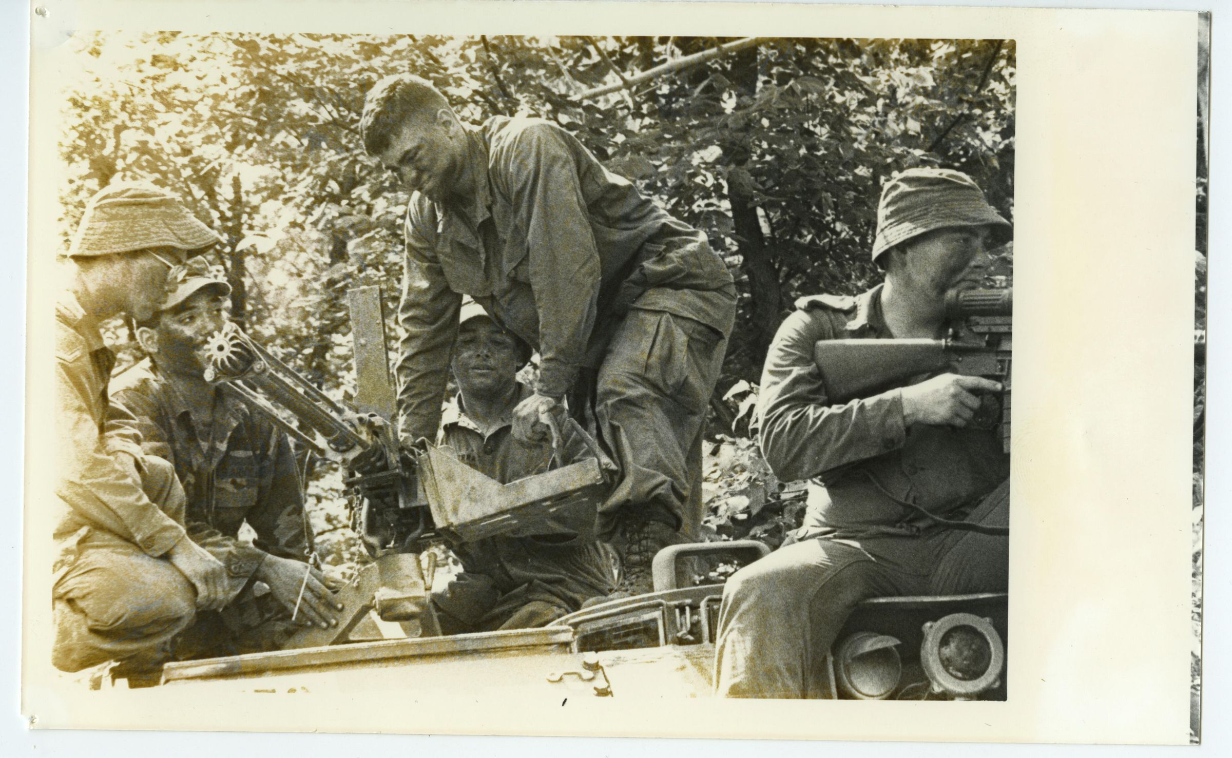 National Guard soldier explaining the operation of a machine gun on top of an M113 APC to soldiers for The Royal Montreal Regiment during cross-training at Camp Drum in New York.Photograph Details