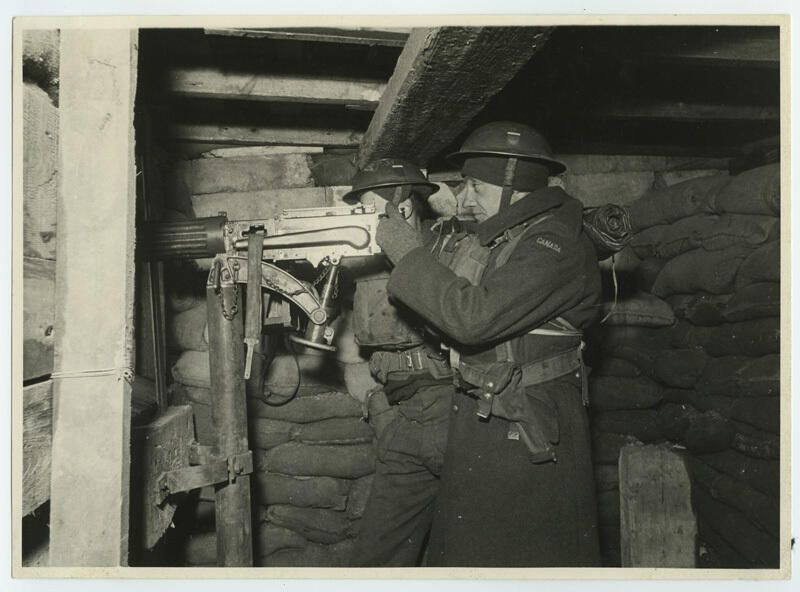 Two men are standing in a covered bunker. They are aiming a Vickers Machine gun.Photograph Details