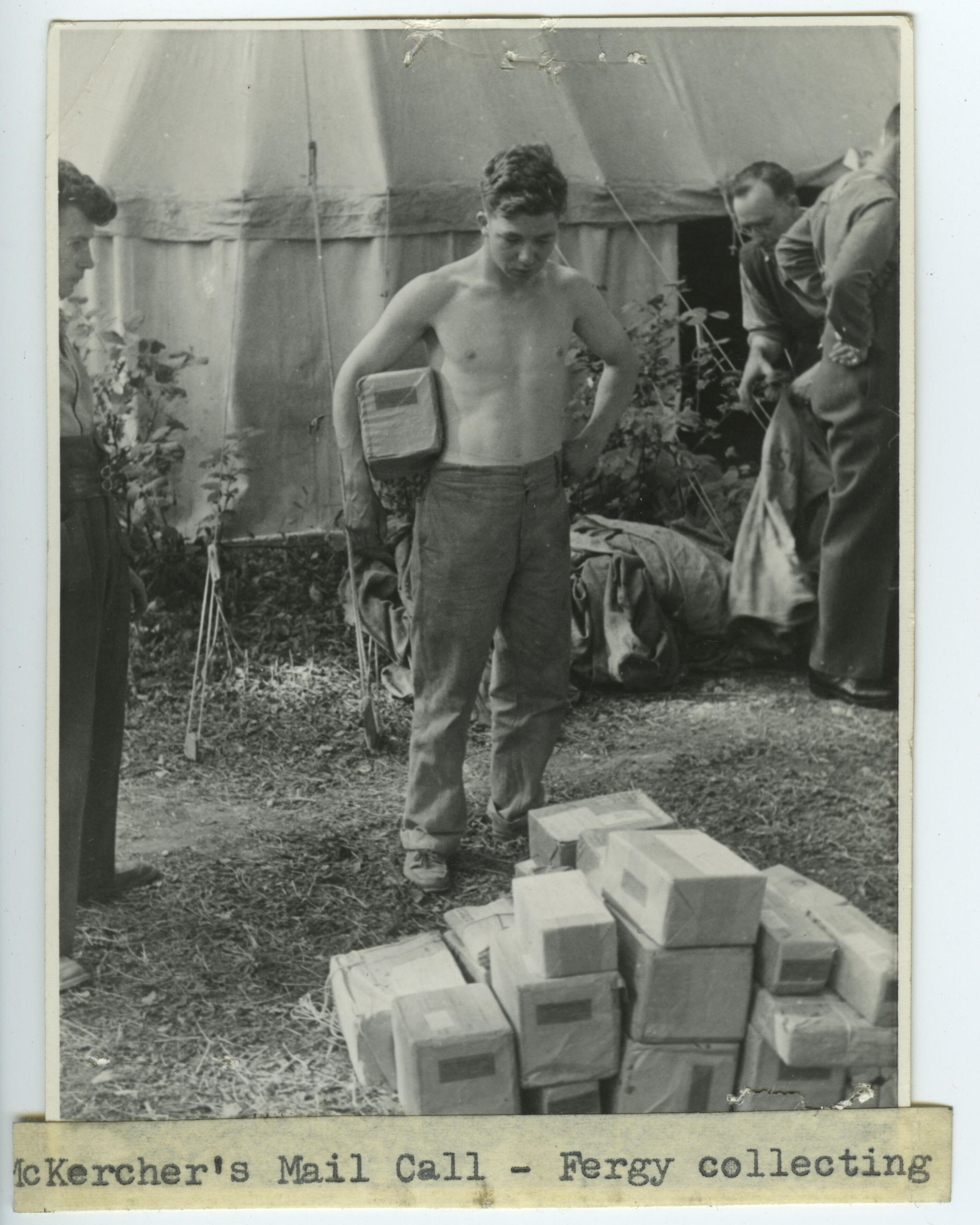 A black and white photo of members of the 1st Battalion RMR at an encampment in Epsom, Surrey. Private J. Ferguson is holding a parcel and looking through the mail parcels piled on the ground to see if he might have received a second one.Photograph Details