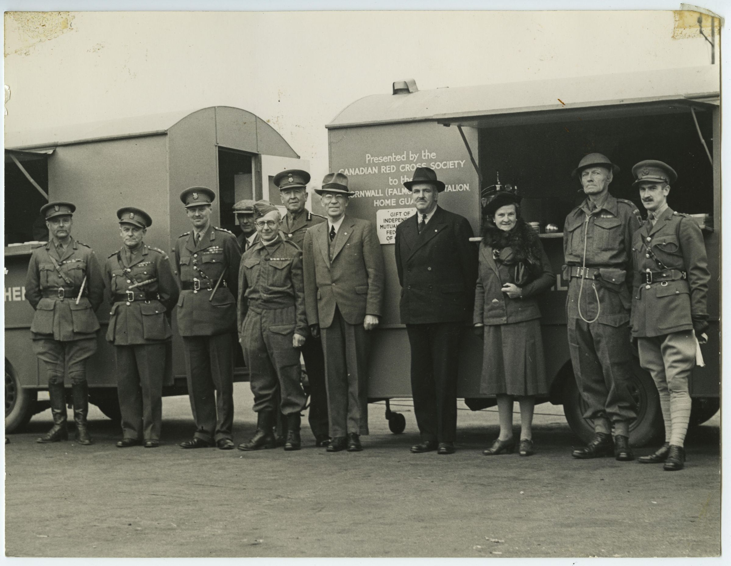A black and white photo of Maj Gen (retired) C.B. Price, the Overseas Commissioner of the Canadian Red Cross Society, and several Staff Officers, standing in front of two mobile Soup/Coffee kitchens presented by the Canadian Red Cross to the Cornwall (Falmouth) Battalion of the Home Guard.Photograph Details