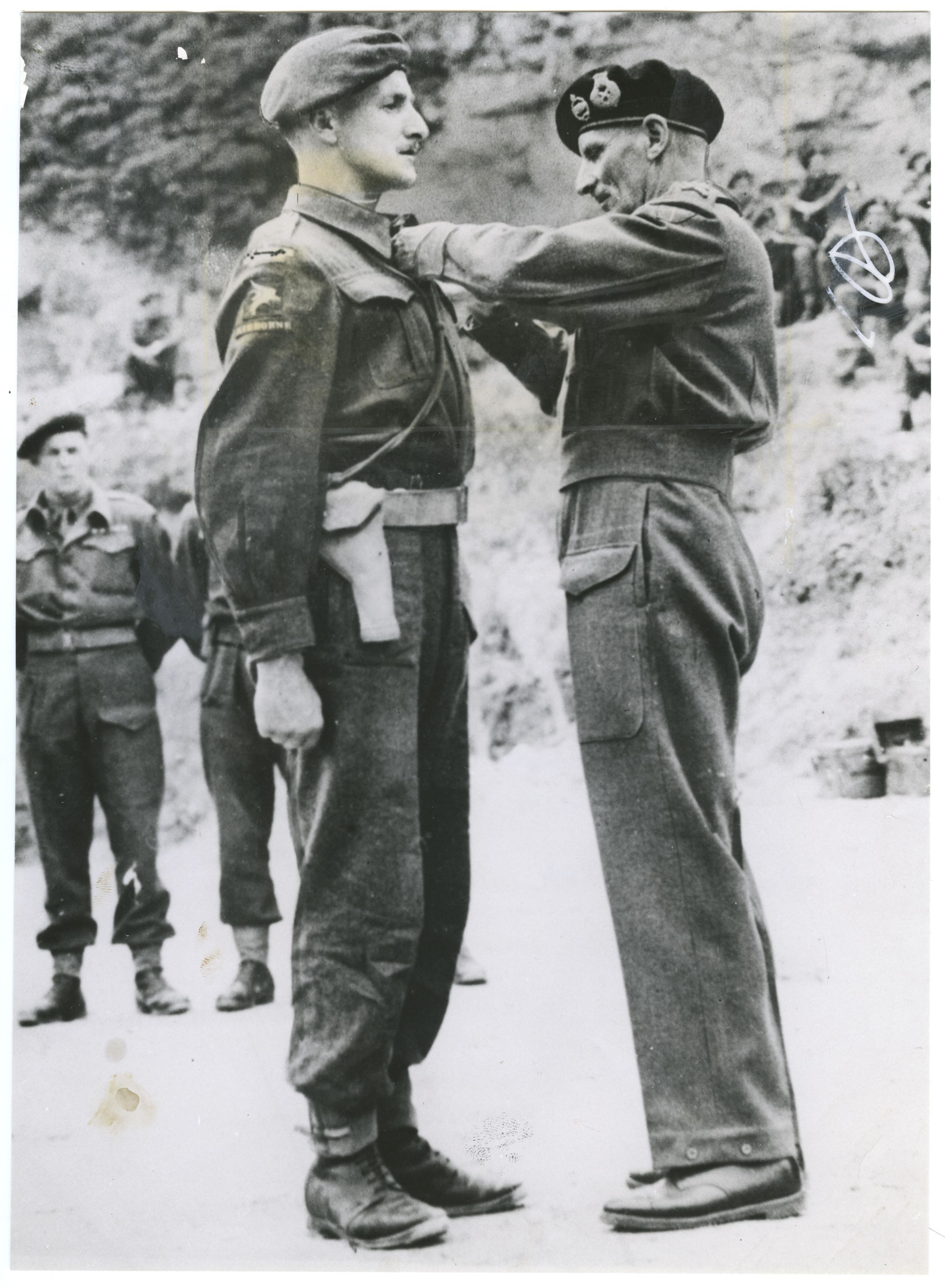 A black and white photo of Major John Hanson being decorated with the Military Cross in the field by Field Marshal Bernard L. Montgomery, the commander of the British forces in France. Major Hanson who started his service with The Royal Montreal Regiment went on to serve as a company commander with the 1st Canadian Parachute Battalion in Normandy.Photograph Details