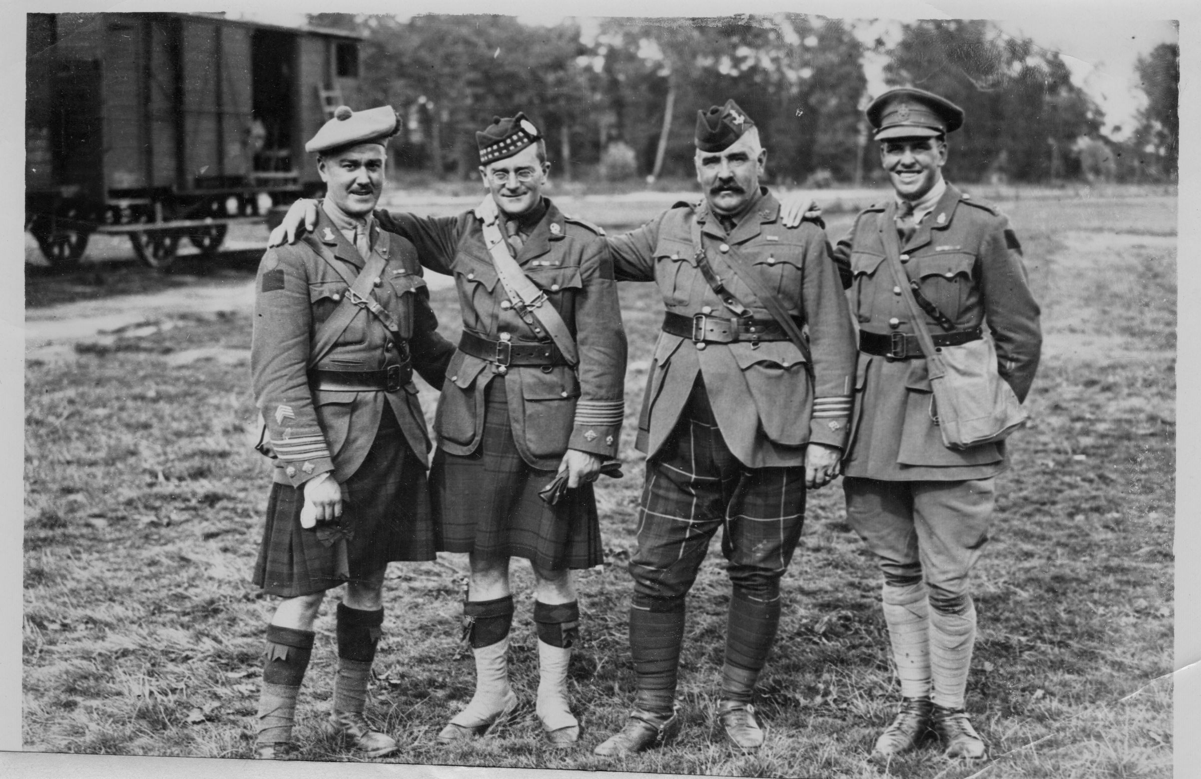 Black and white informal portrait of four officers standing in a field. Behind them is a patch of forest and behind to the left is a train caboose. L-R: Unknown, Lt-Col Charles Edward Bent, C.O. of the 15th Bn. C.E.F. (48th Highlanders), Lt-Col Cyrus Weseley Peck, C.O. of the 16th Bn C.E.F. (Canadian Scottish) and Major Charles Basil Price.Photograph Details