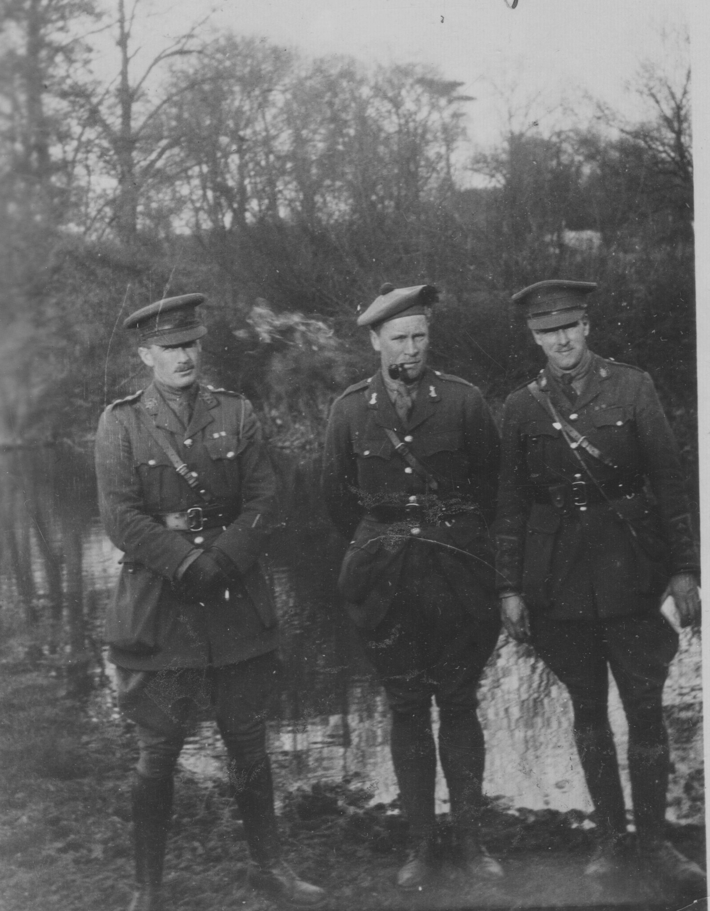 Three soldiers in full uniform standing on the bank of a muddy pond. The men seem to all be from different regiments, with Major Price on the far right representing the RMR. Behind them is a barren patch of forest.