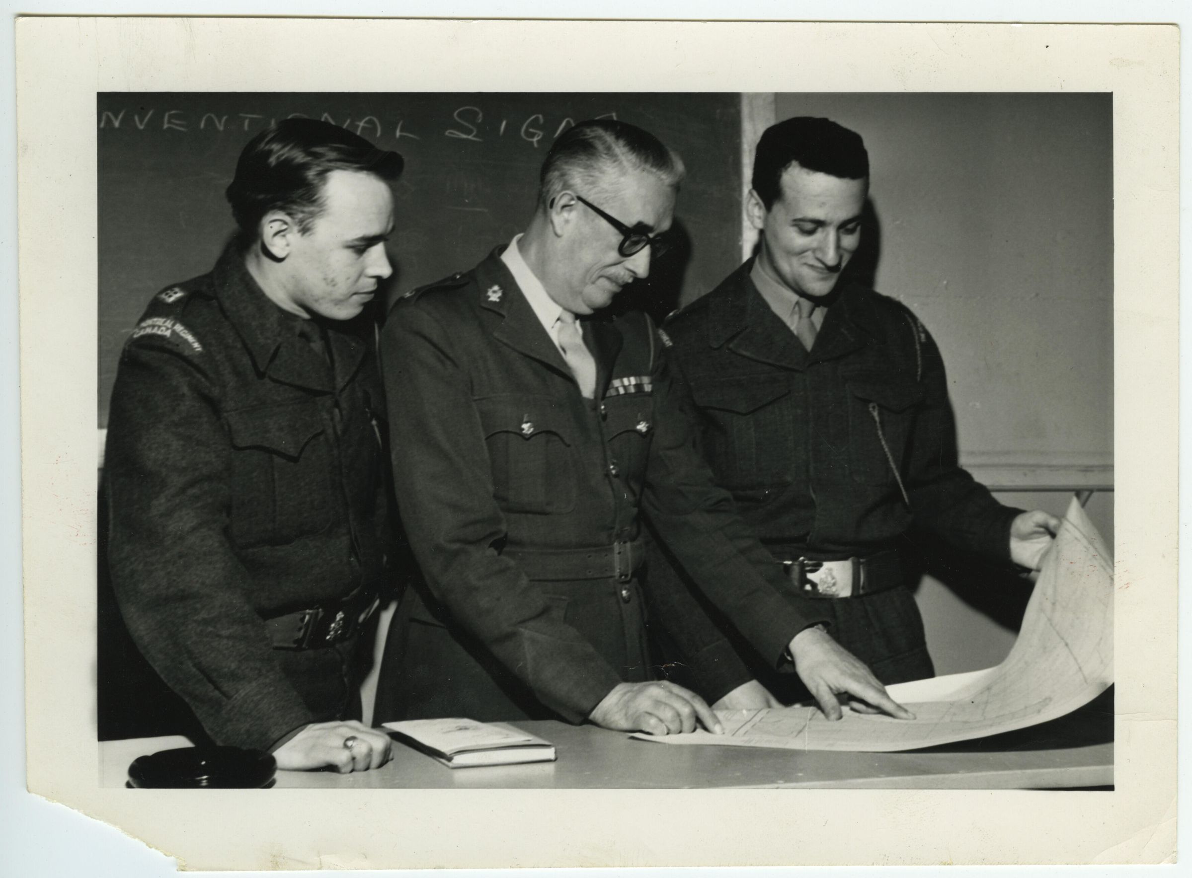 A black and white photo of two young Second Lieutenants in the company of a Major. They are studying a topographic map.Photograph Details