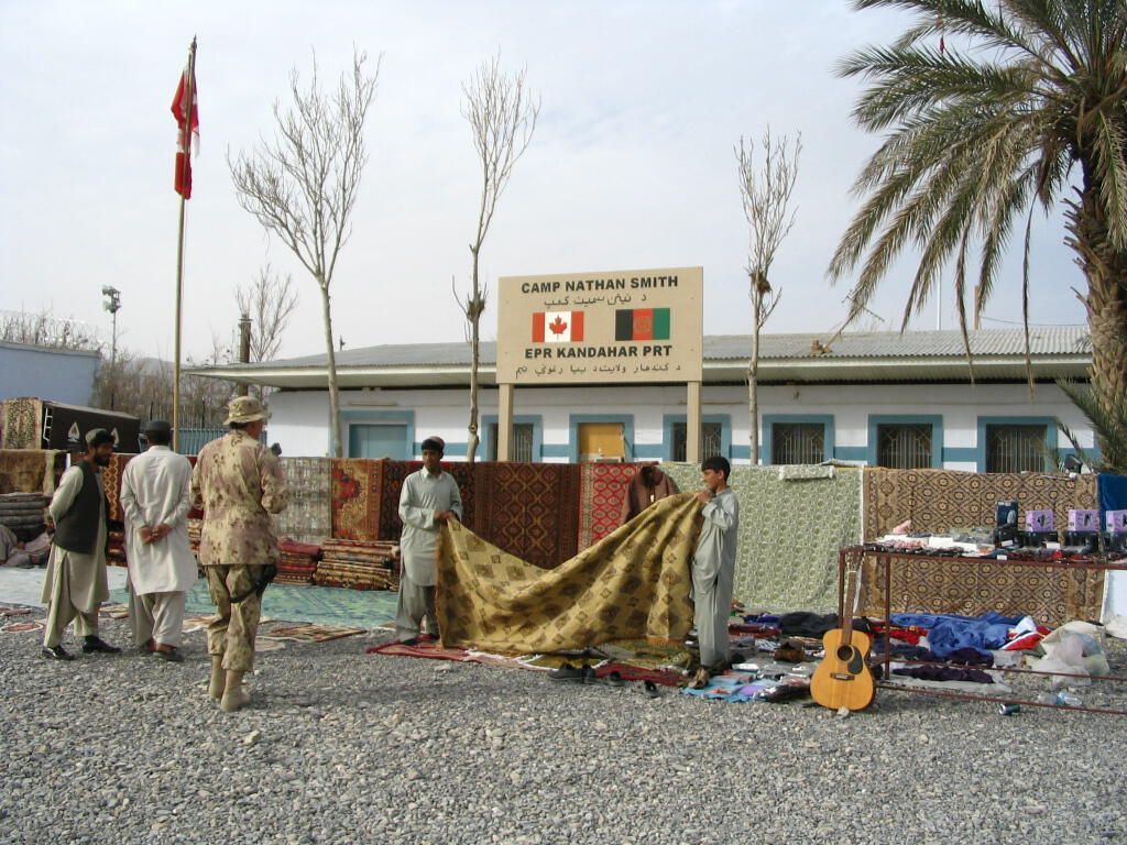 A small bazaar assembled at the entrance of Camp Nathan Smith near Kandahar City. Given the dangers of living and serving in a Combat Zone, Canadian soldiers were not permitted to venture into the usual public Bazaars of Kandahar City. Consequently, these merchants would come to the soldier. The merchants, and their merchandise, were thoroughly inspected and they would be given access to a controlled zone of the military base.