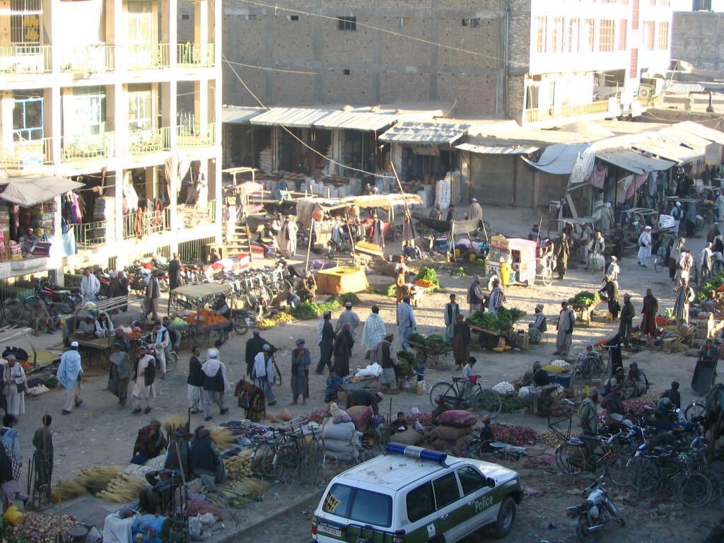 A scene from the streets of Kandahar City where the farmers and merchants are busy with market duties. They have laid out their merchandise and products for sale for people to see.Photograph Details