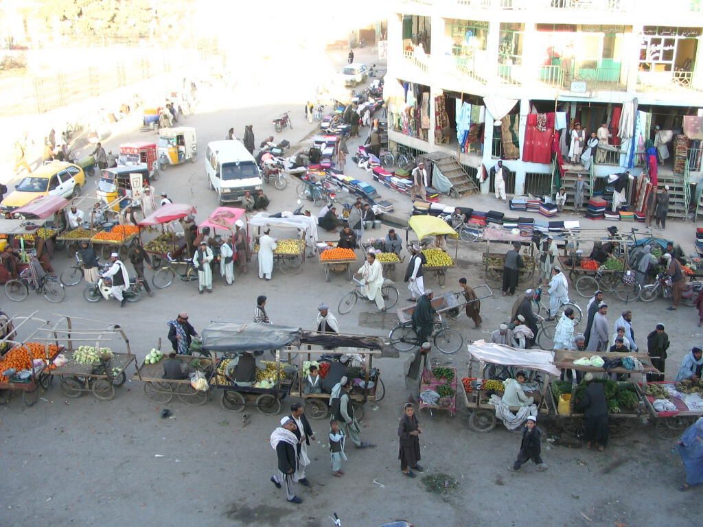 A scene from the streets of Kandahar City where the farmers and merchants are busy with market duties. They have laid out their merchandise and products for sale for people to see.Photograph Details