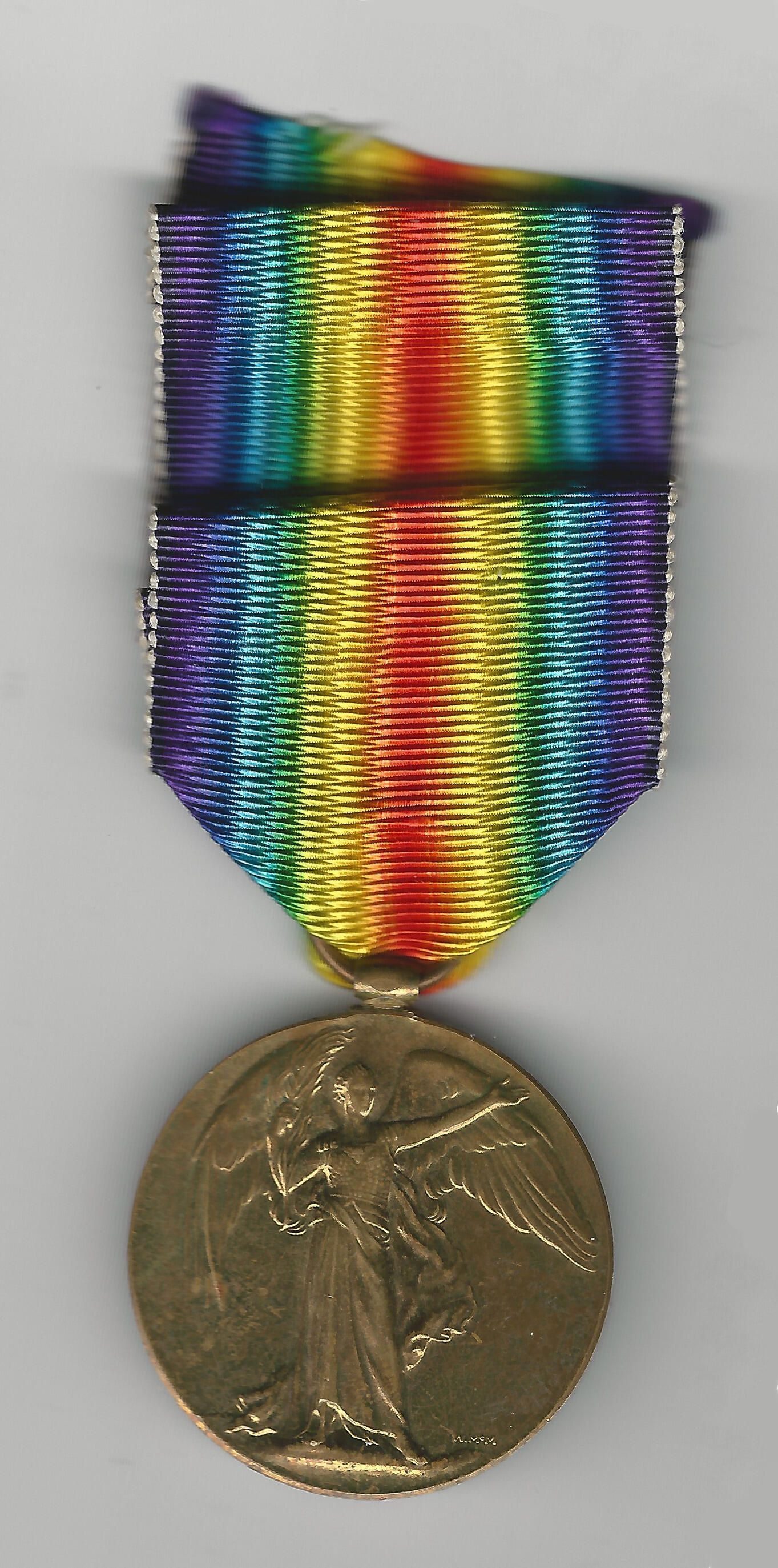 Victory Medal, the Inter-Allied War Medal. A circular, copper medal, in lacquered bronze, with a size of 1.42 inches in diameter. For mounting purposes, there is a ring passing through a loop fixed to the top of the medal. The ring moves forwards and backwards but not sideways. The obverse shows the winged, full-length, full-front, figure of Victory, with her left arm extended and holding a palm branch in her right hand.Inscription/Signature/Marks