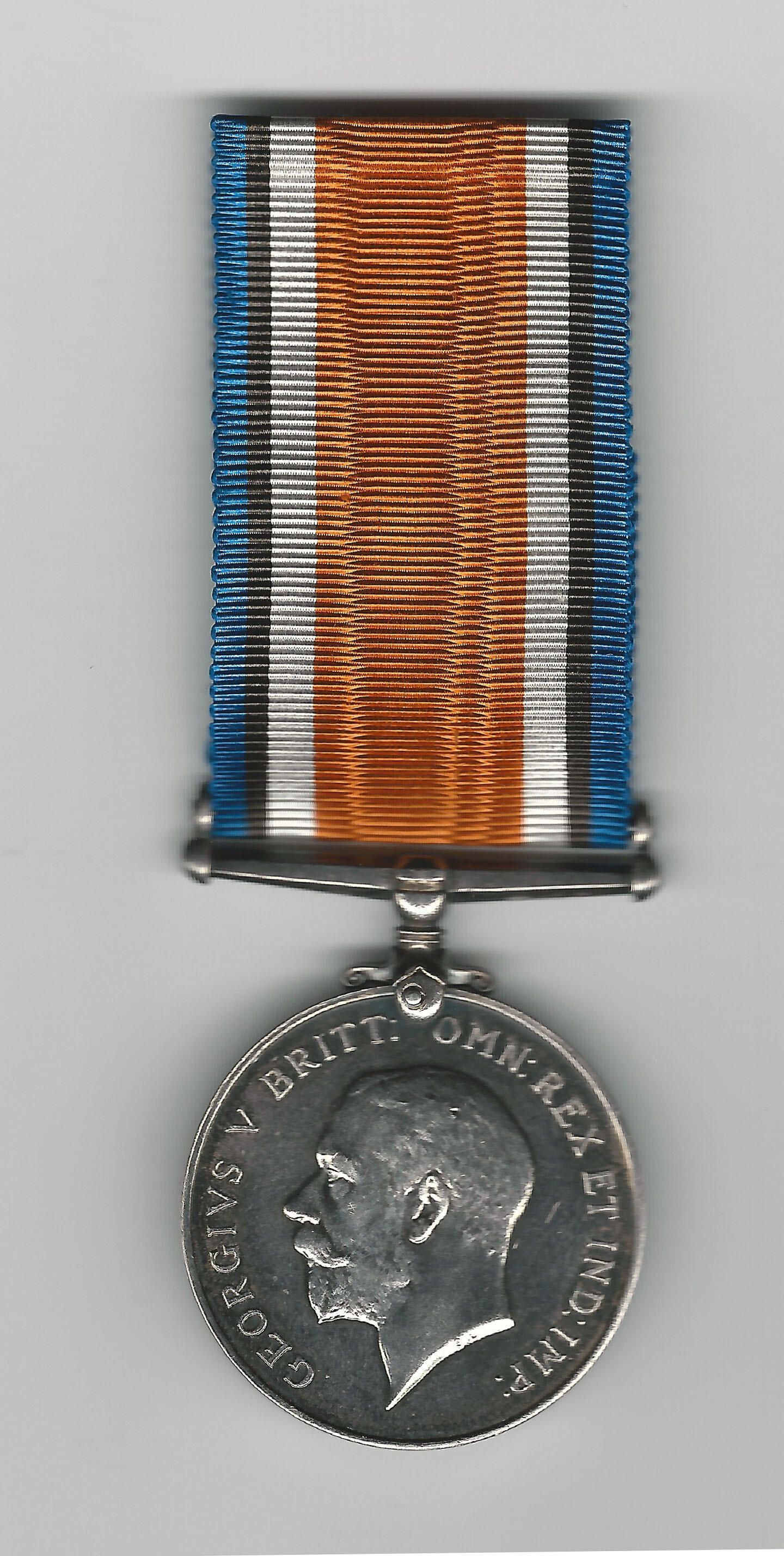 British War Medal. A circular, silver medal, 1.42 inches in diameter.The obverse shows the King George V, bareheaded coinage effigy, facing left. On the reverse, there is a horseman, St. George, armed with a short sword.Inscription/Signature/Marks