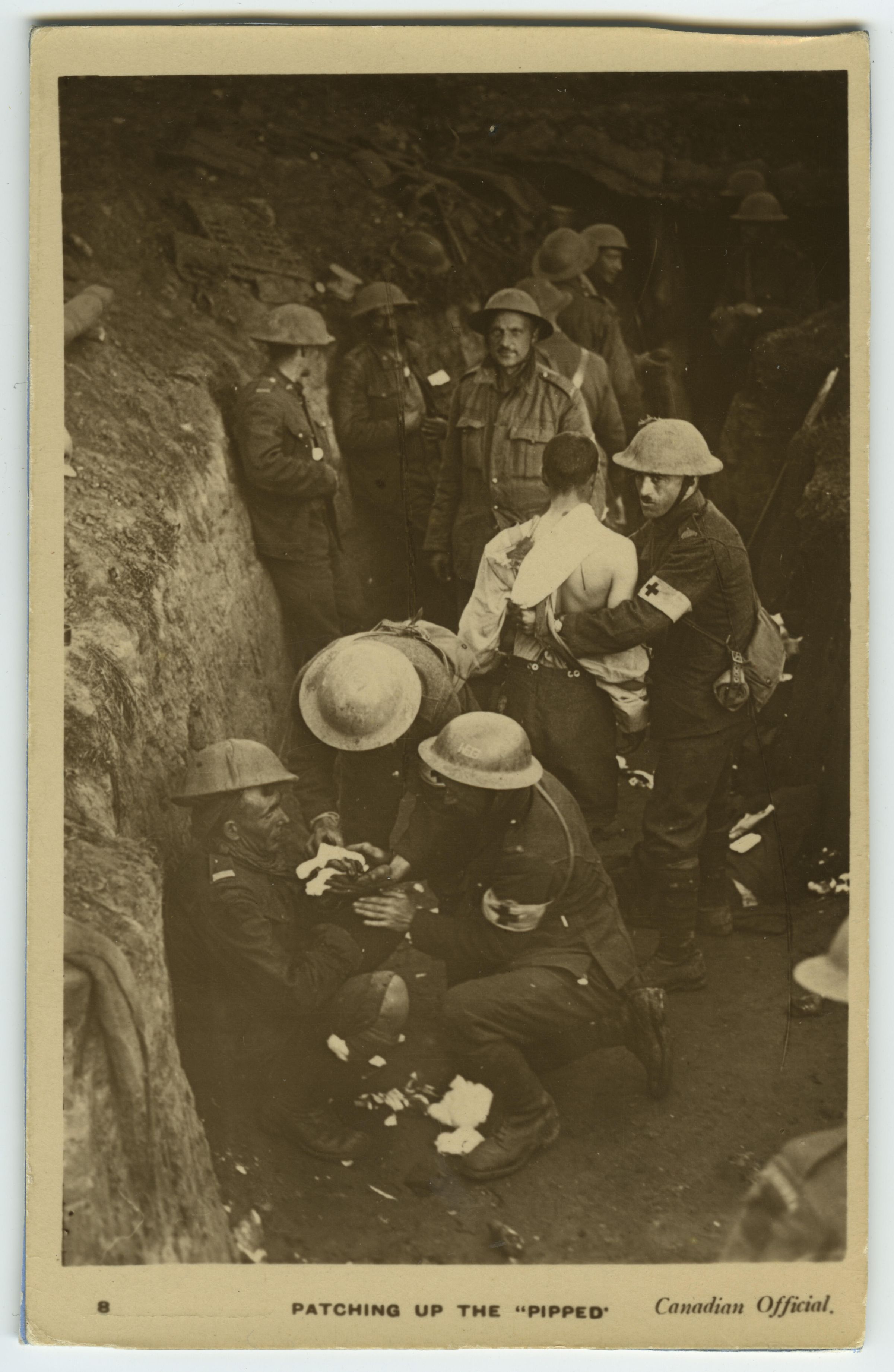 In a trench, three medics are tending to wounded soldiers. One soldier is seated while medics attend to him. On the right another medic wraps roller bandages around the bare torso of another soldier.Made/Created