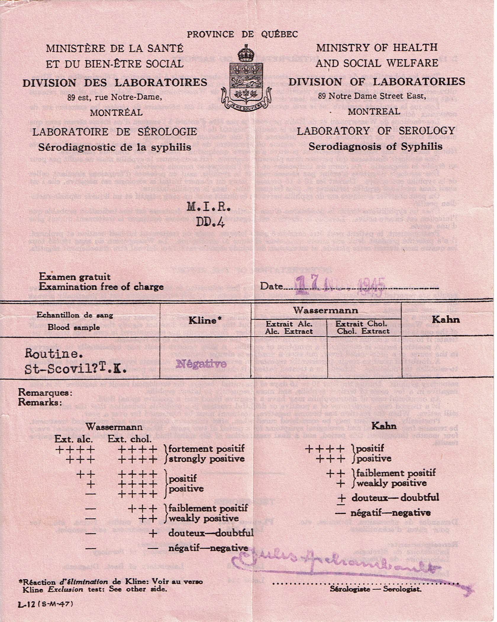 As part of a return to Canada and to civilian life, Lieutenant Thomas K. Scovil was given a blood test for syphilis. The test came back negative.Relationships