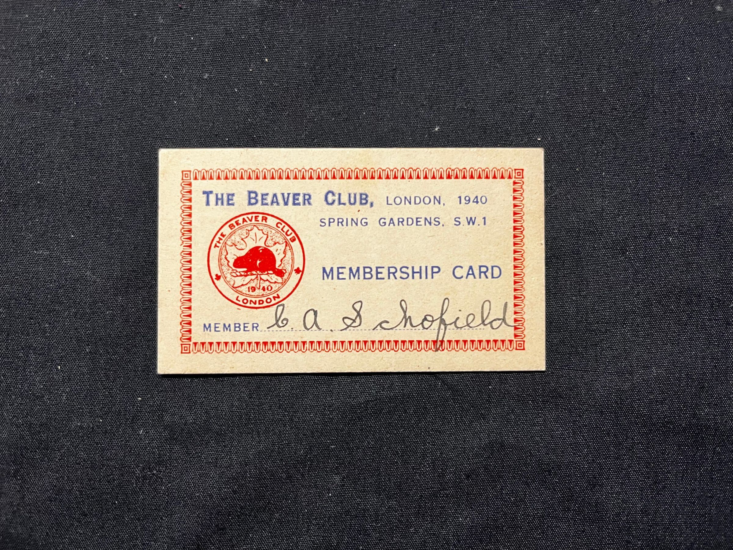 Small card, made of thick cardstock. It is a cream colour and there is a red decorative border on the front. The Beaver Club logo is in red. It is signed by Charles Arthur Schofield.