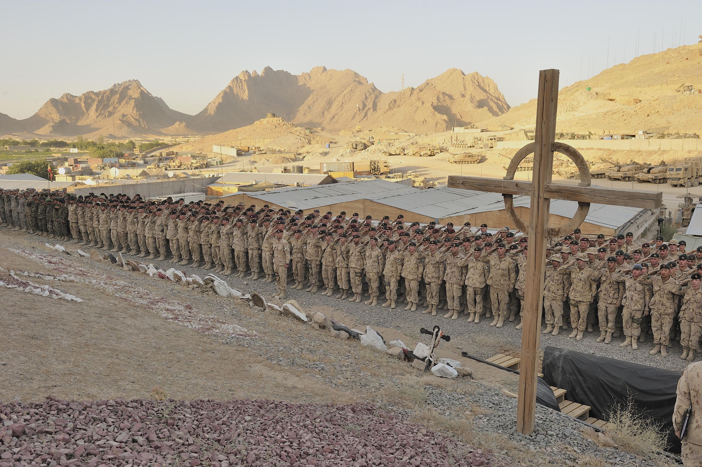The troops are paying their respect and saluting the Canadian Flag Hillside Marker and memorial field at the Forward Operating Base (FOB) in Masum Ghar.