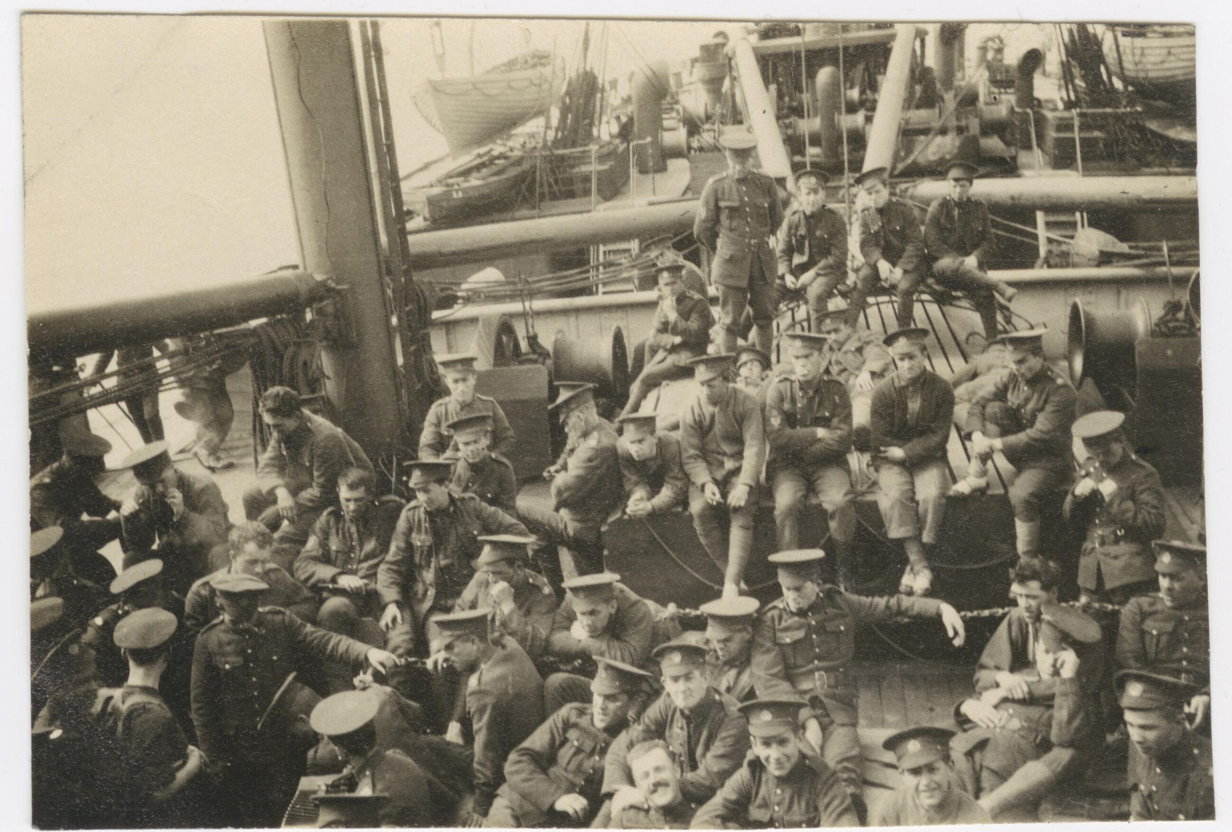 Sepia, Black and white picture showing men of the 163rd Bn CEF in uniform, relaxing on the deck of a ship. They are all facing the camera and most are smiling.Made/Created