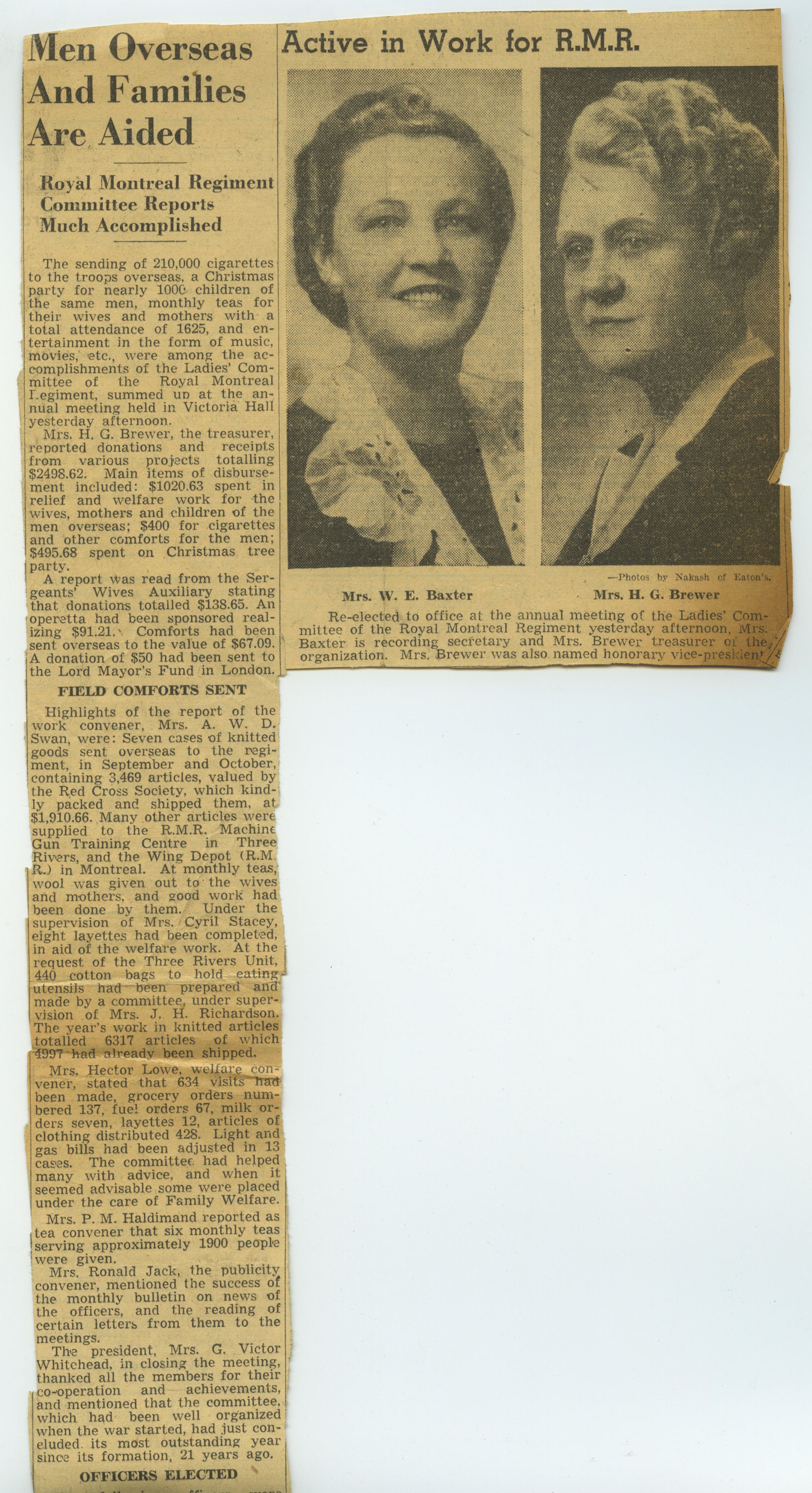 A newspaper clipping of an article about the work of members of The Ladies Committee of The Royal Montreal Regiment. The Committee was very active organizing many fundraising campaigns to support the troops overseas and the families of The Royal Montreal Regiment members. Two of the ladies involved in this work, Mrs. W.E. Baxter and Mrs. H.G. Brewer, are pictured at the right of the articleLexicon