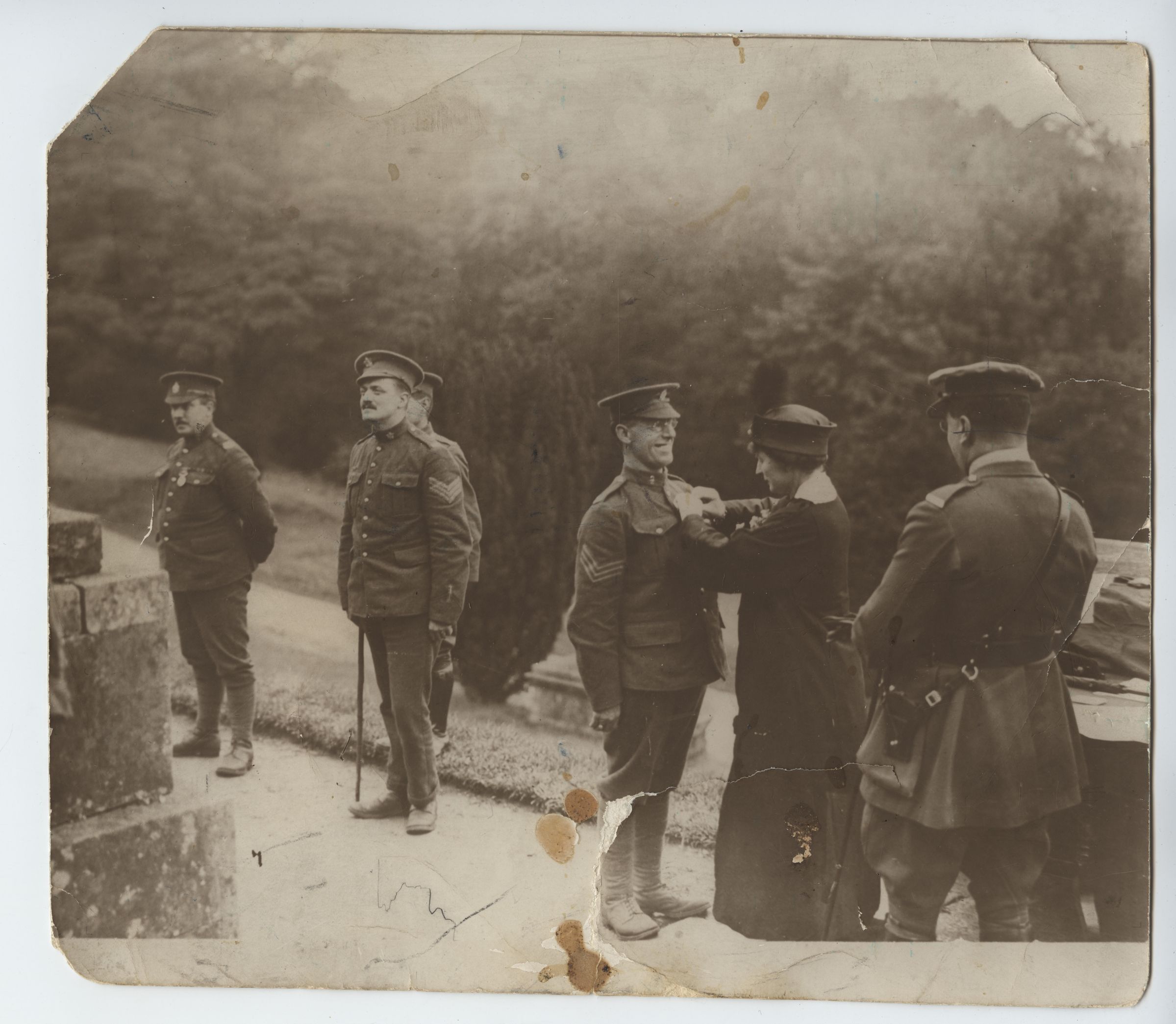 A sepia photograph of three soldiers receiving a medals from a lady (senior dignitary). The man in the forefront is smiling as his medal is being pinned on his chest.