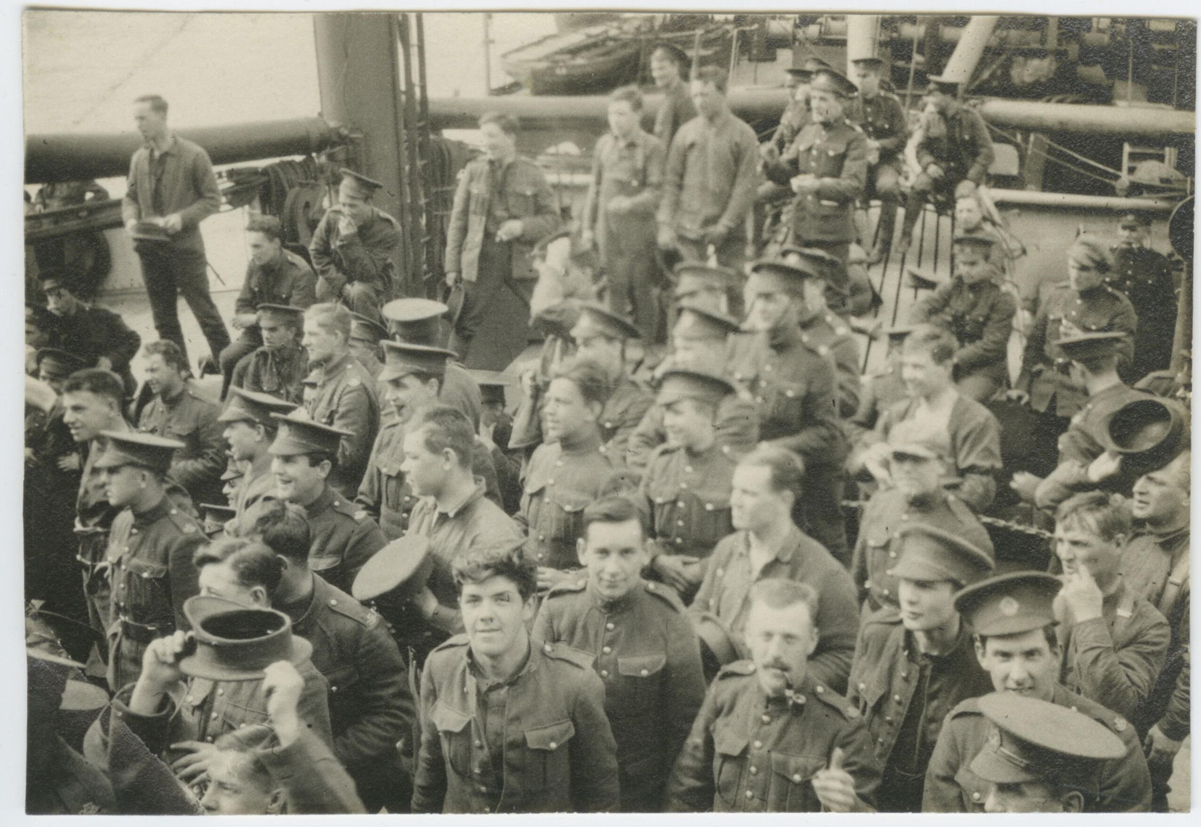Sepia, Black and white picture showing men of the 163rd Bn CEF in uniform, standing on the deck of a ship. They are all facing the front and most of them are smilling.Made/Created