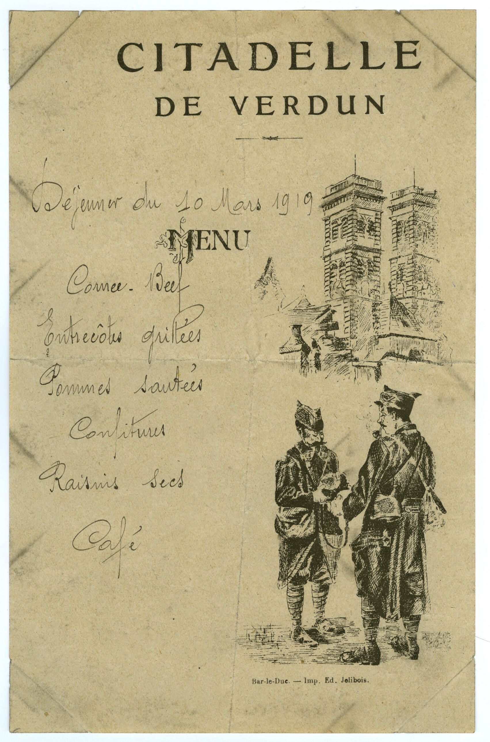 Menu for the Lunch of March 10, 1919, at the Citadelle de Verdun. The details of the menu are handwritten with black ink, in French. On the c.r. is a black lithograph drawing of two towers. In front of the tower are two French soldiers.