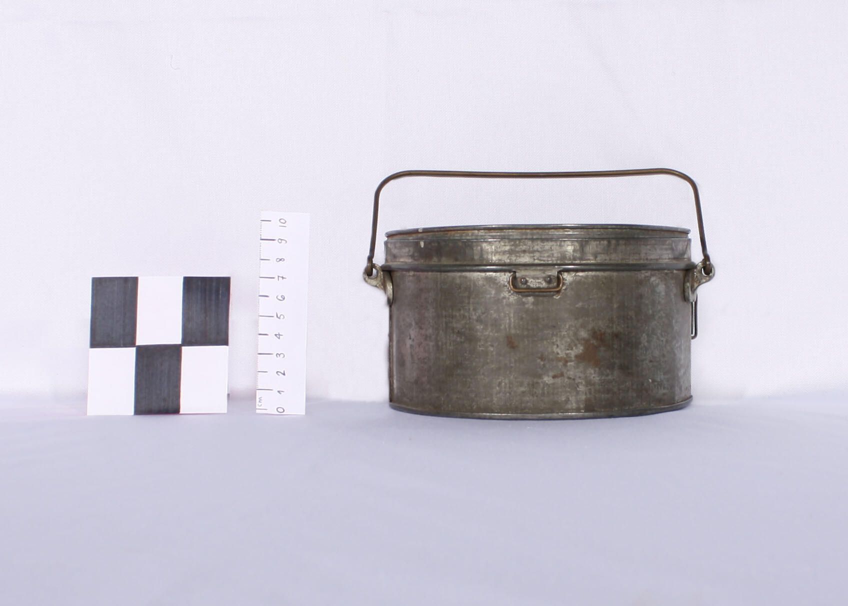 British 1918 “D-style” tin mess tin with a moving handle. It consits of two parts: the container and the cover.