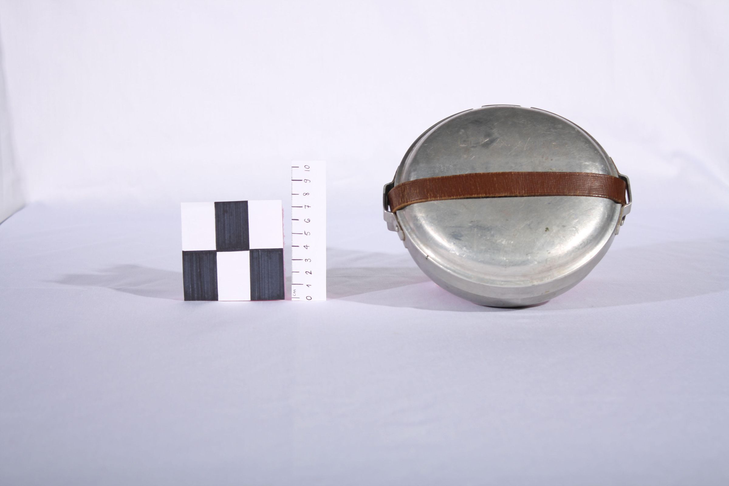 Round metal mess tin kit with a plate inside. It is held together by a leather strap. Similar in style to a British WWI cavalry mess tin set. This WWII set would have been purchased privately by an officer for his own use. The set was carried in a light canvas case - see 2003.17.01.Made/Created
