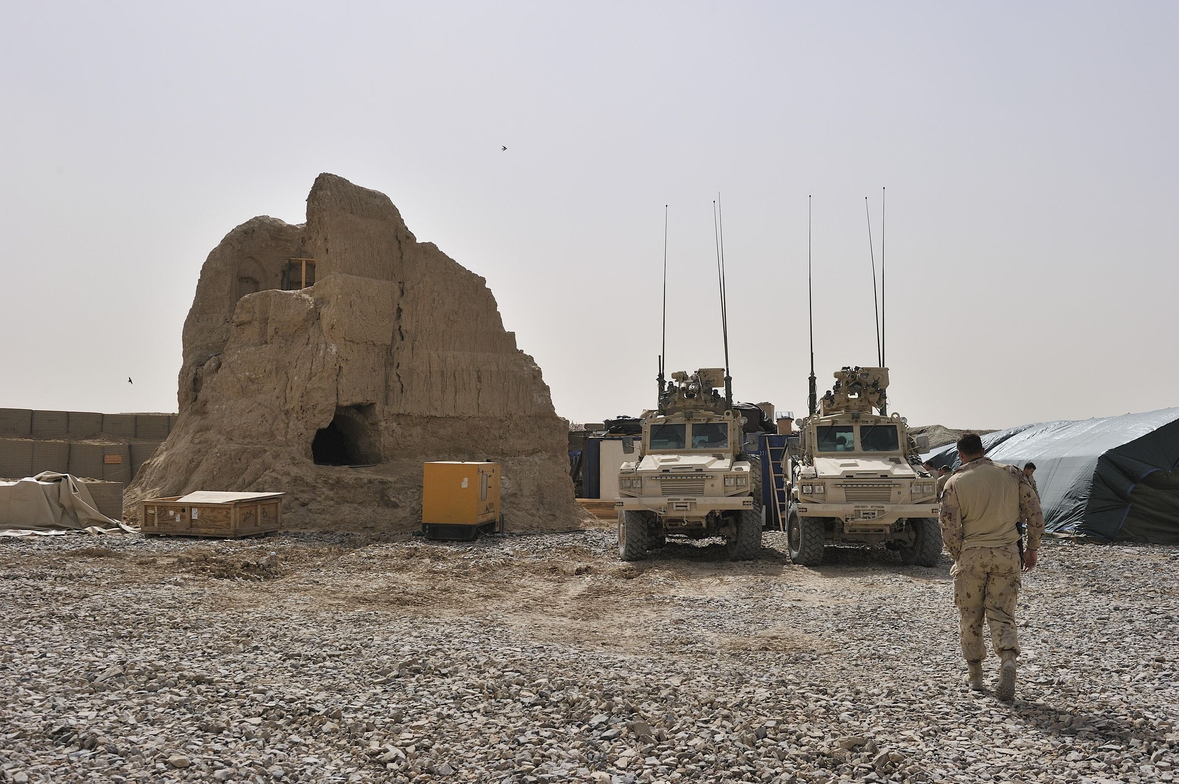 This military camp is surrounded by a line of Hesco bastions, earth-filled defensive baskets used worldwide to create perimeter protection barriers. Made to be temporary accommodations to mitigate vehicle-borne improvised explosive devices, they have evolved to offer quick deployable semi-permanent security fence solutions.Photograph Details
