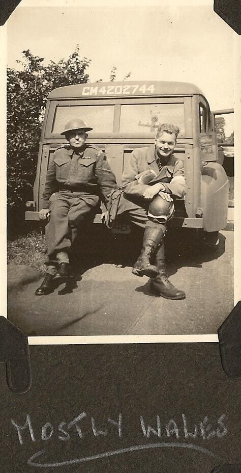 A black and white photo of Private Thomas K. Scovil and Lance Corporal Eddy Lavery, the CO's driver & batman, seated on the bumper of a 1941 Ford C11AD militarized station wagon. Pte Scovil is wearing a pair of dispatch rider boots and a jerkin. He is holding his helmet and goggles on his knee. Eddy Lavery is wearing a battledress uniform and helmet along with three WWI medal ribbons on his left breast.Photograph Details