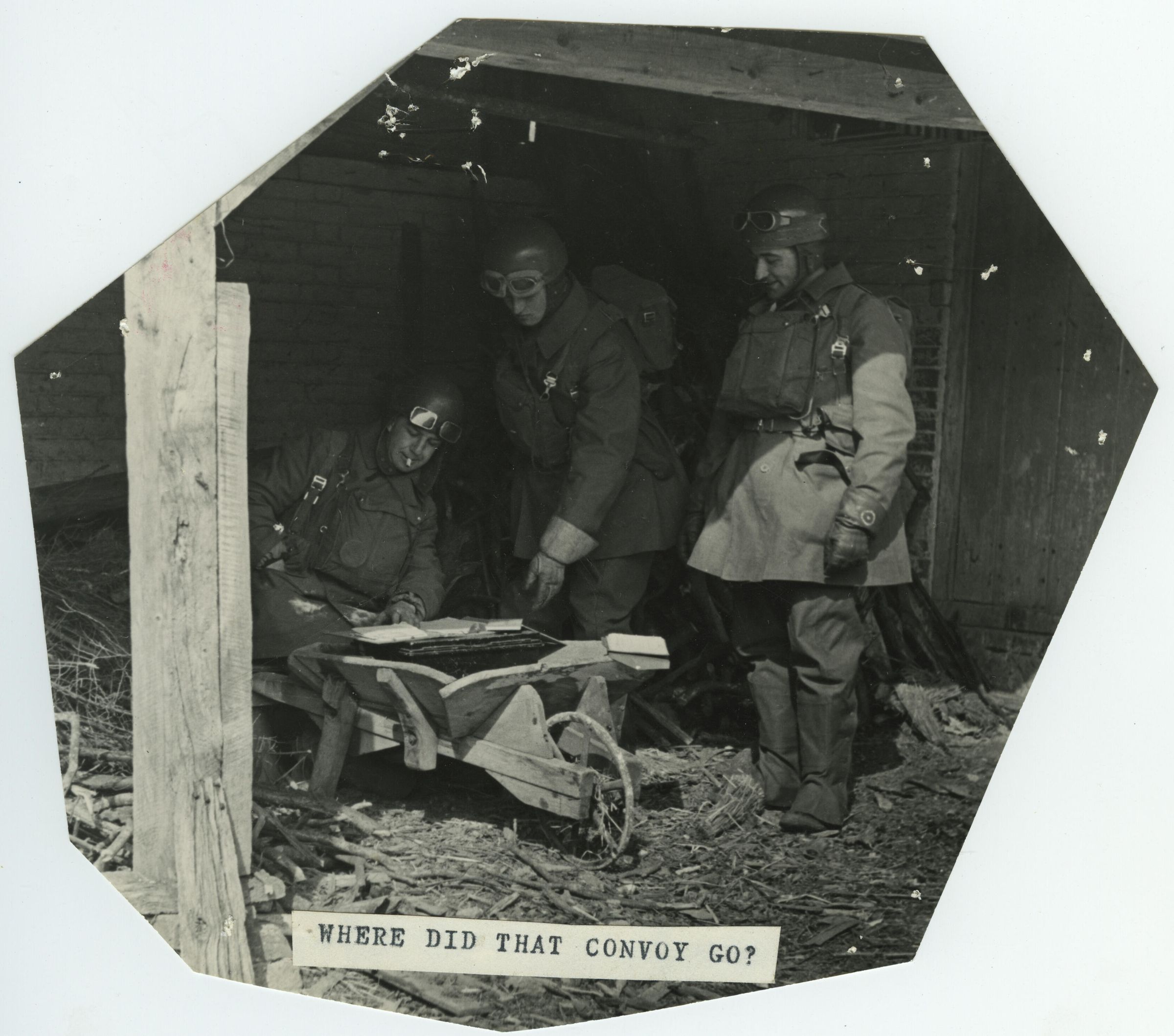 A black and white photo which has been trimmed to an irregular shape It shows three soldiers in the uniform wearing the helmet and goggles usually worn by despatch riders along with their cased respirators across their chest. They are consulting a map using a wheelbarrow as an impromptu table.Photograph Details