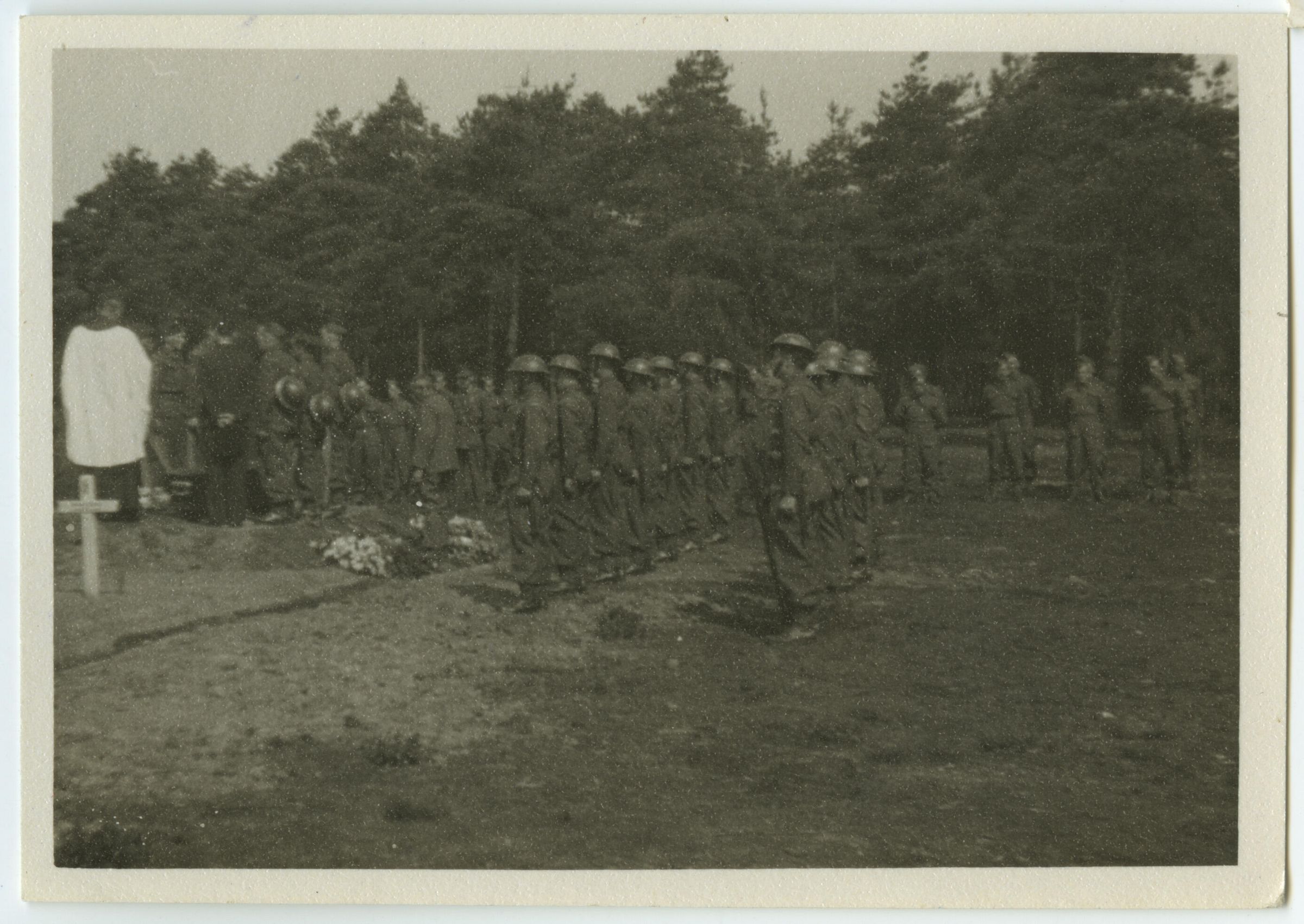 The burial of Private Walter Williamson who was killed accidentally in England on June 19, 1941. On the left the priest in his white surplice is reading the burial service before the casket between the uniformed pall-bearers with their helmets slung on their backs. In the foreground is an honour guard wearing their helmets.