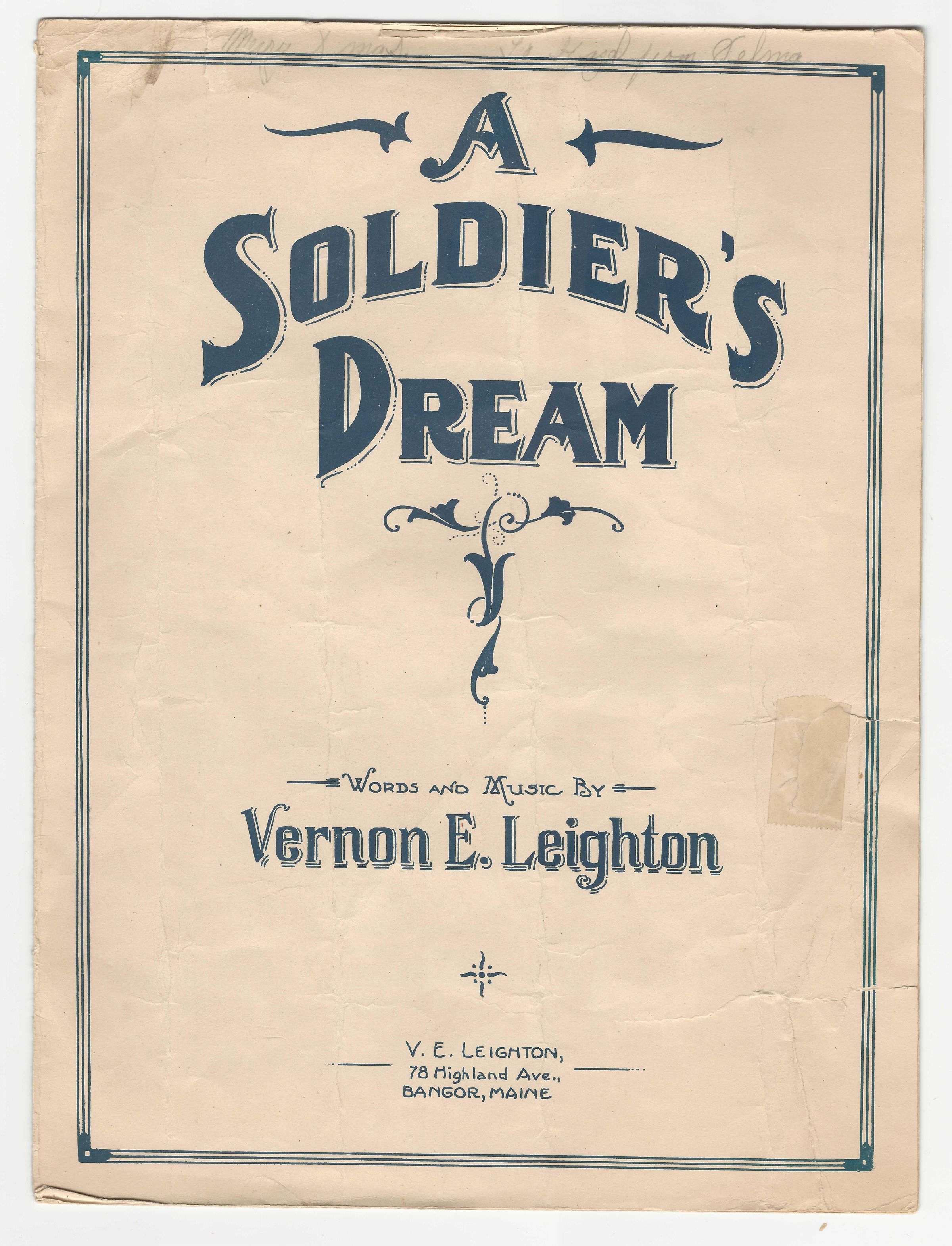 5 pp. The music sheet with notes and lyrics of the song A Soldier's Dream by Vernon E. Leighton.