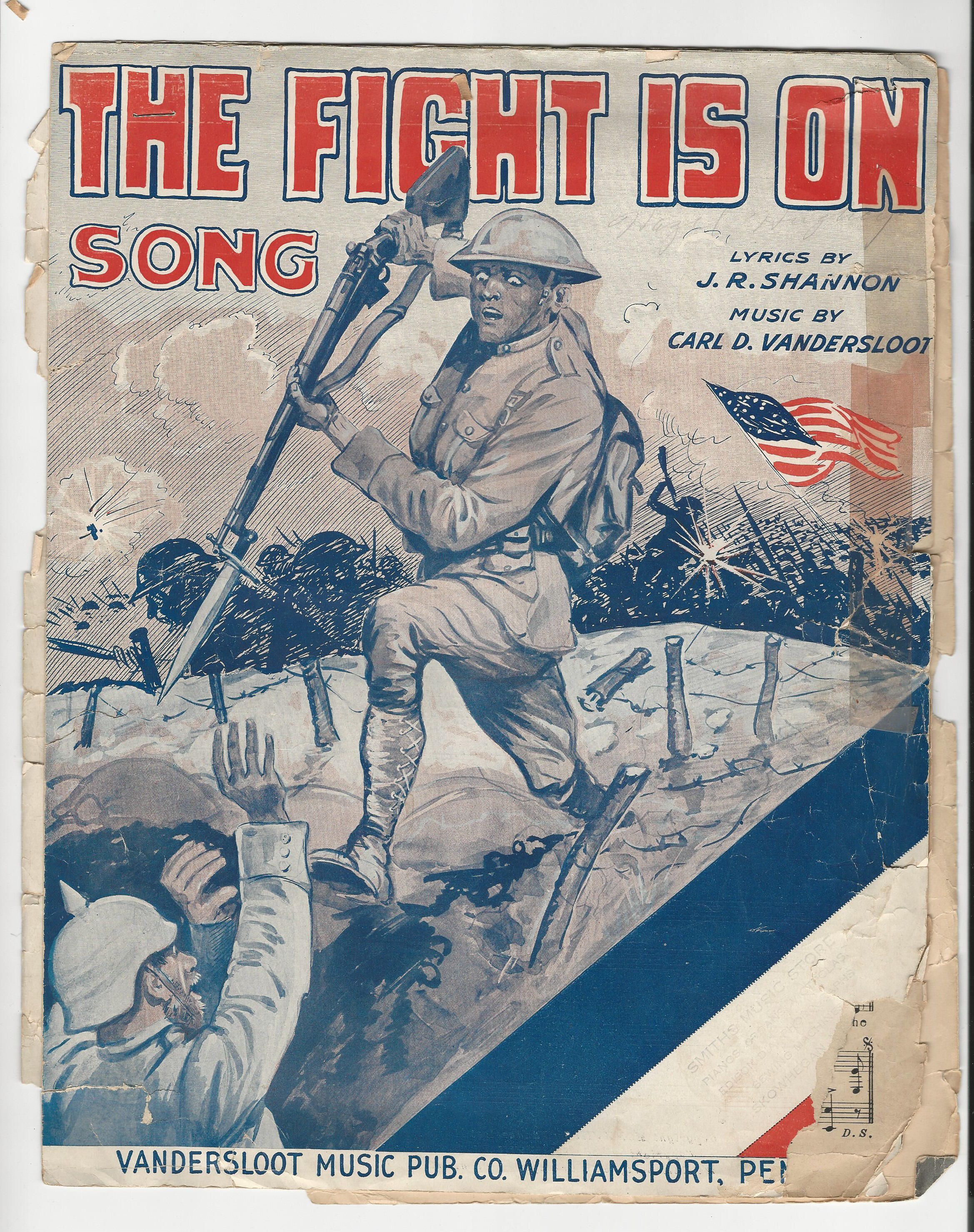 Two illustrated music sheets with notes and lyrics for piano and voice. One is titled "The Fight is On" and contains lyrics by J. R. Shannon and music by Carl D. Vandersloot. It was published in 1918 by the Vandersloot Music Publishing Co., of Williamsport, Penn., USA. The second music sheet, titled "Break The News to Mother" was published in 1897 by Chas. K. Harris during the Spanish American War.Publication Details