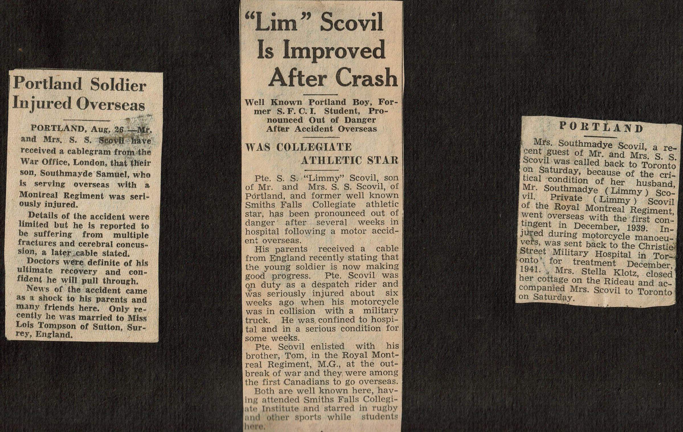 A series of three newspaper clippings detailing the accident, the injuries suffered, and the recovery of Private Southmayde "Lim" S. Scovil, at the Christie Street Military Hospital, in Toronto.Relationships