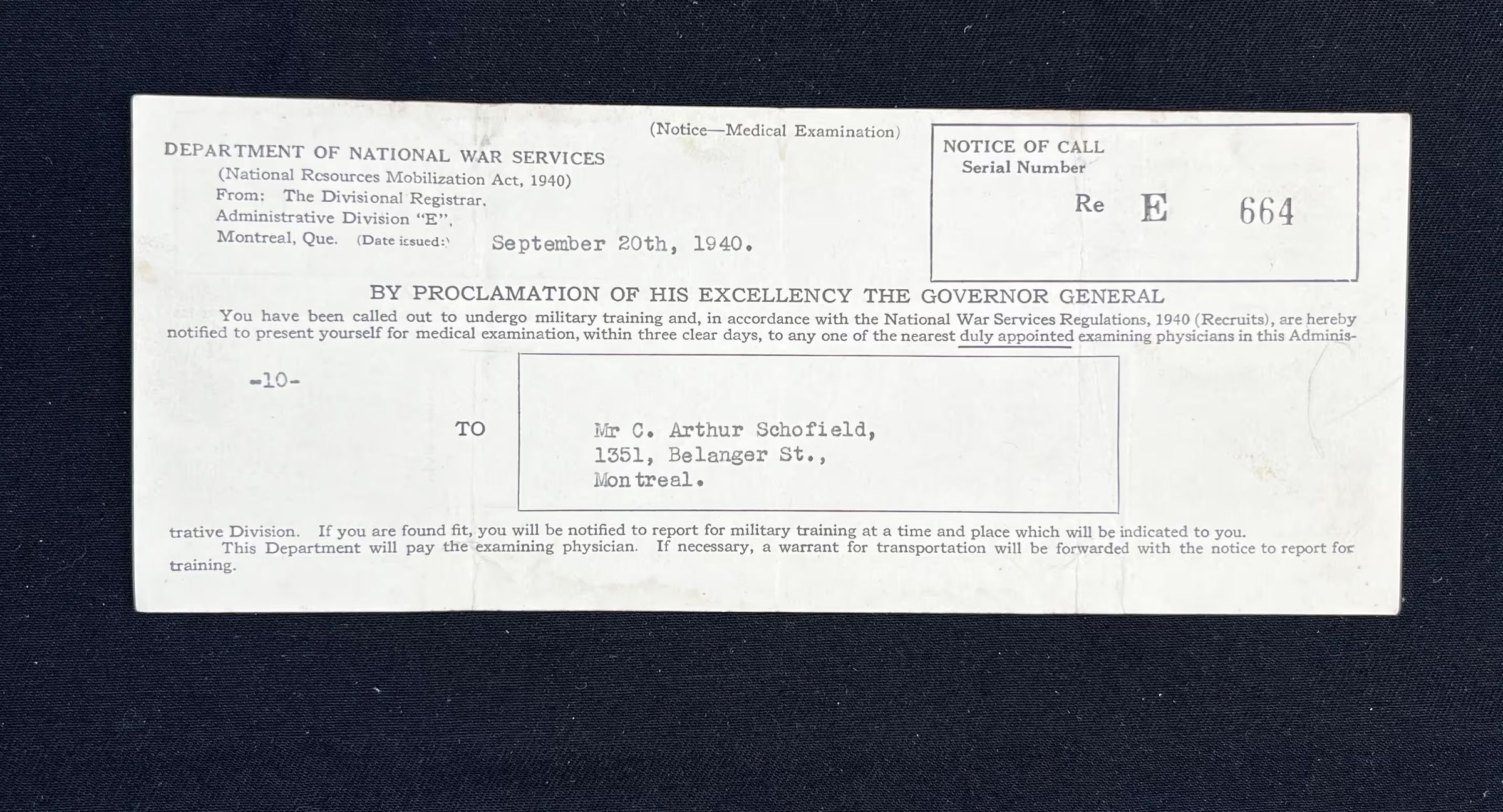 Notice from the Department of National War Services, calling for Charles Arthur Schofield to complete his medical examination, in order to undergo military training.Subject
