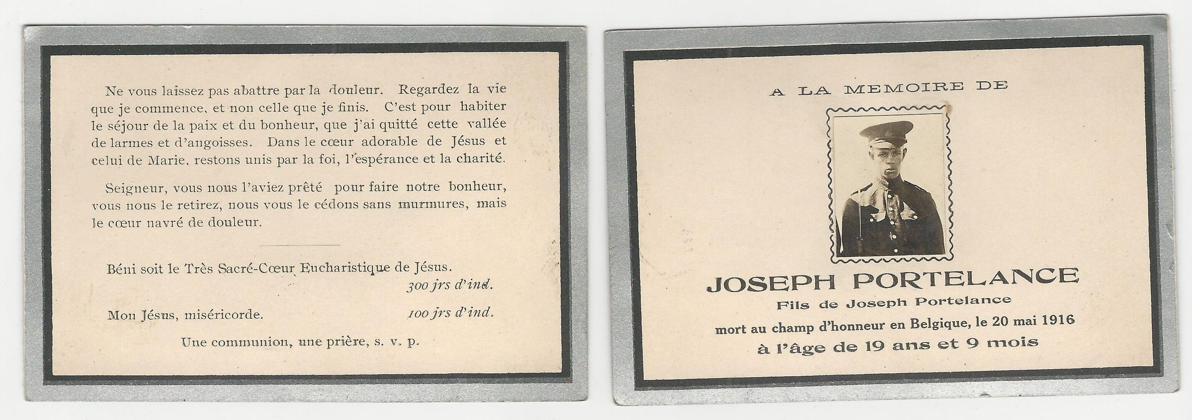 An "In Memoriam" Card issued in memory of Private Joseph Portelance of the 14th Battalion who was killed in action May 20, 1916, at the age of 19 years 9 months.Relationships