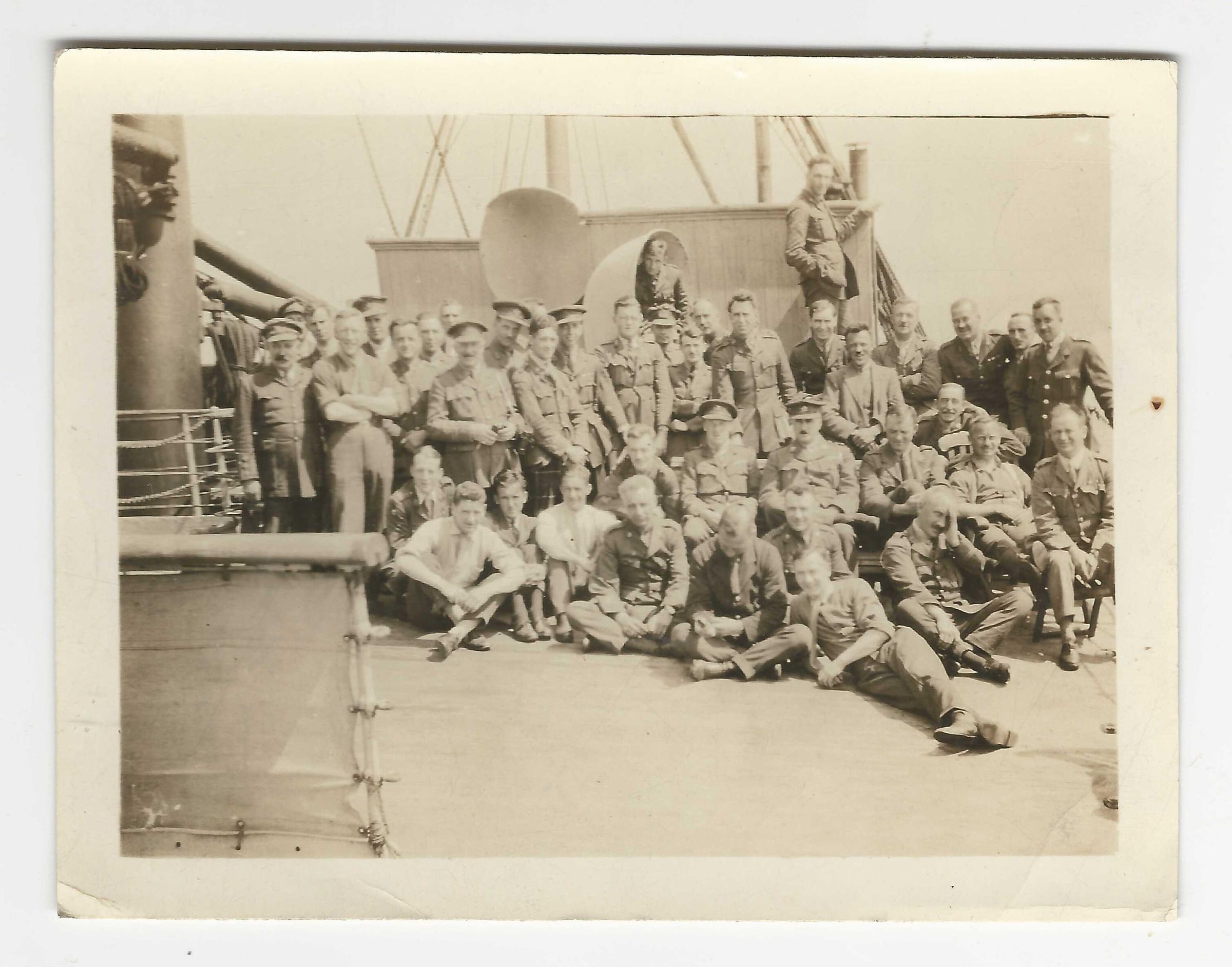 A large group of officers in uniform are sitting and standing on the deck of a ship.Made/Created