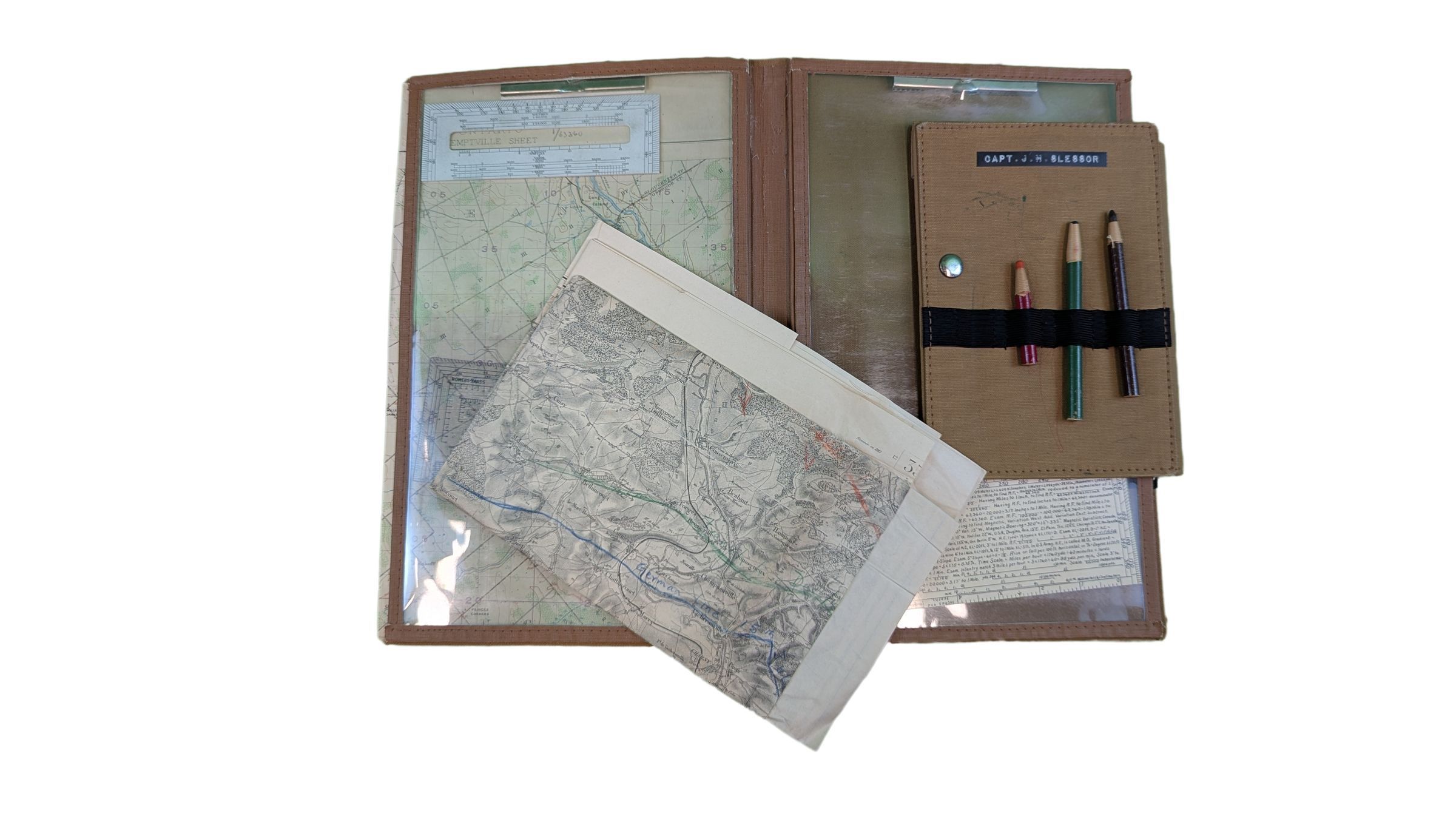 Canvas and leather map case with maps, rulers, a notebook and pencils, all belonging to Captain J. H. Slessor. The map case itself is made of a brown canvas covered board with clear plastic (talc) sleeves that are quite rigid. Inside the sleeves there are numerous maps, some with notes some without, and also a selection rulers, protractors, etc. Attached is a brown canvas field service notebook, with three coloured China graph pencils attatched with a wide elastic band. The notebook has a plastic label with the name of "CAPT J.H. SLESSOR", who used the map case while Adjutant, then Quartermaster during the 1960’s.Use