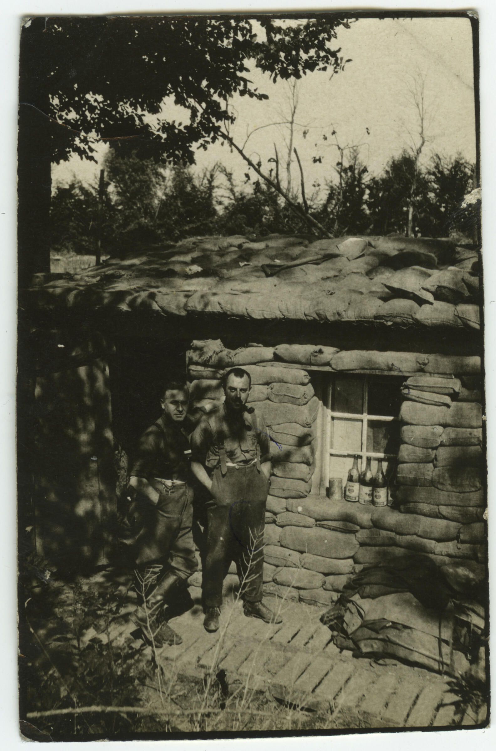 A black and white photo of two officers in shirtsleeves attire. They are standing in the doorway of a shelter in the woods. The structure has sandbags protecting the walls and the flat roof. A shovel is lying on the roof. There are "duckboard" sidewalk sections fronting the shelter. Wine or beer bottles are standing on the window sill.