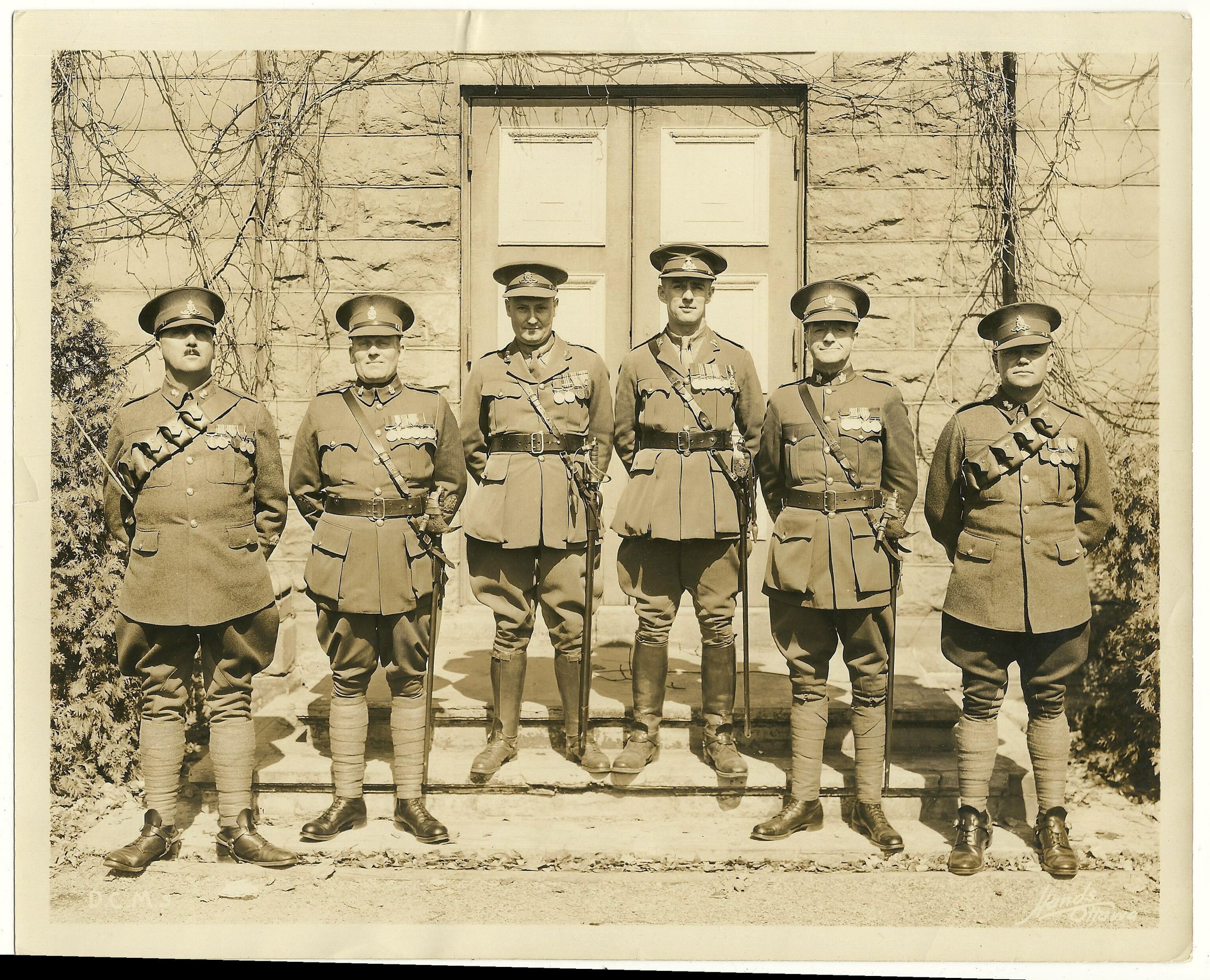 Two officers and four Senior Warrant Officers of the Canadian Coronation Contingent - May 1937 are standing in a row wearing their medals. RSM William Reid Duncan of the RMR is second from the left.Photograph Details